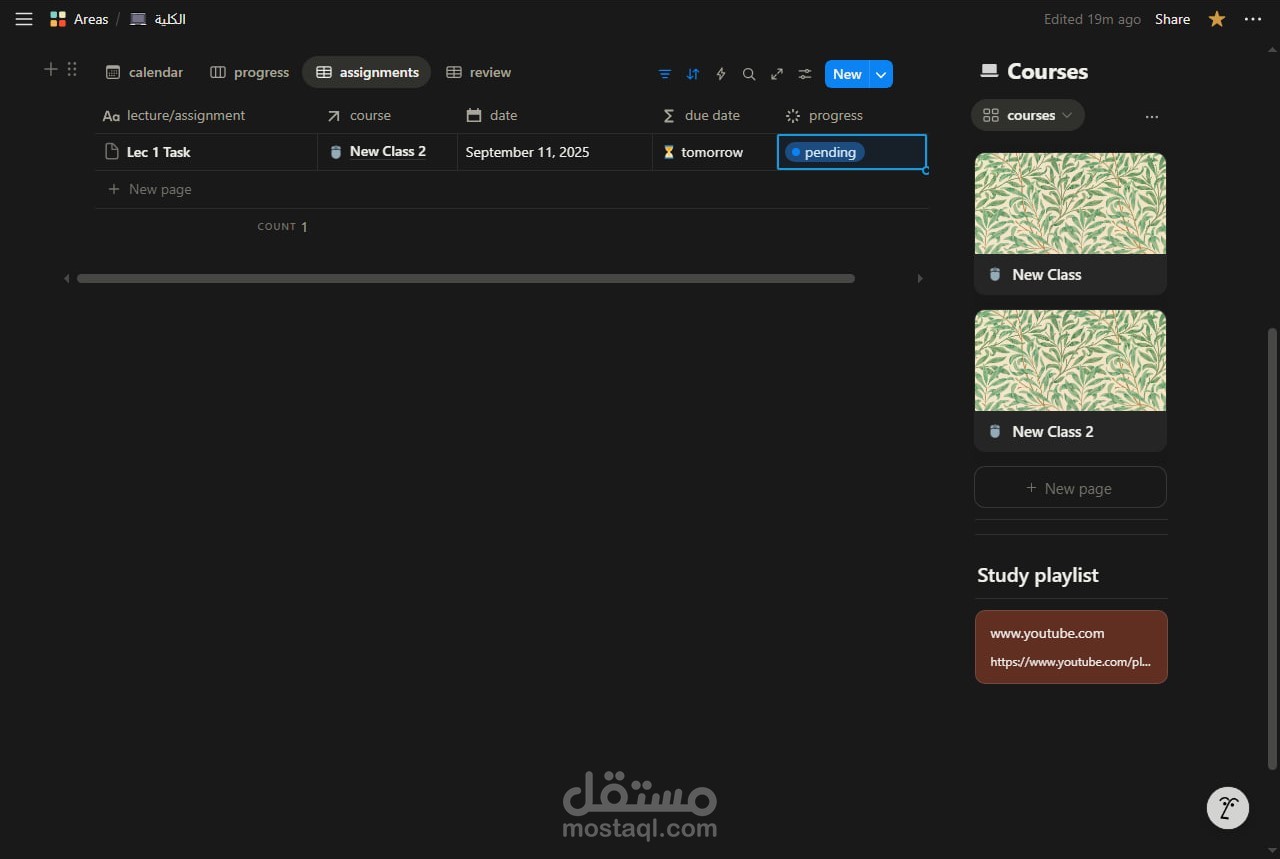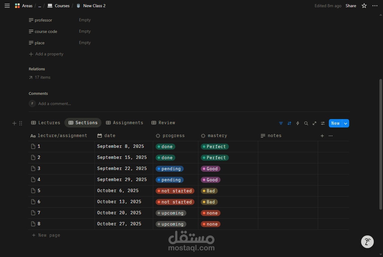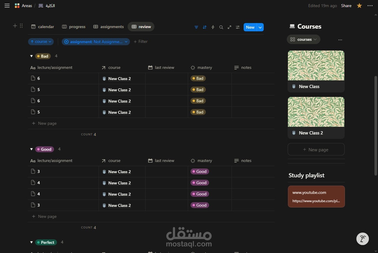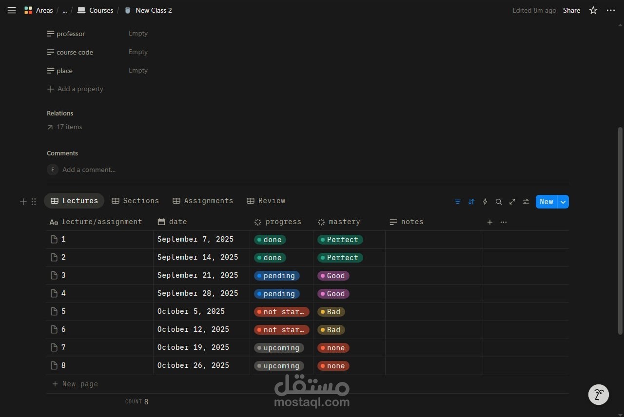 قمت بتصميم وبناء نظام شامل على منصة Notion لإدارة العملية الدراسية وتنظيمها بشكل احترافي ومرن.