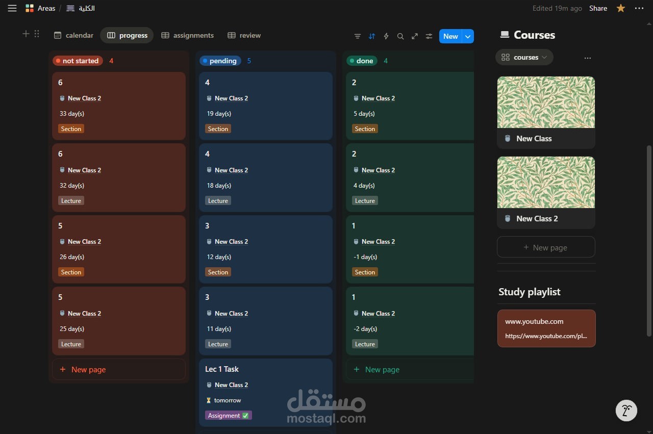 كانبان (Kanban View): لتتبع حالة كل مهمة (تم إنجازها – قيد التنفيذ – لم تبدأ – لم يحن وقتها بعد).