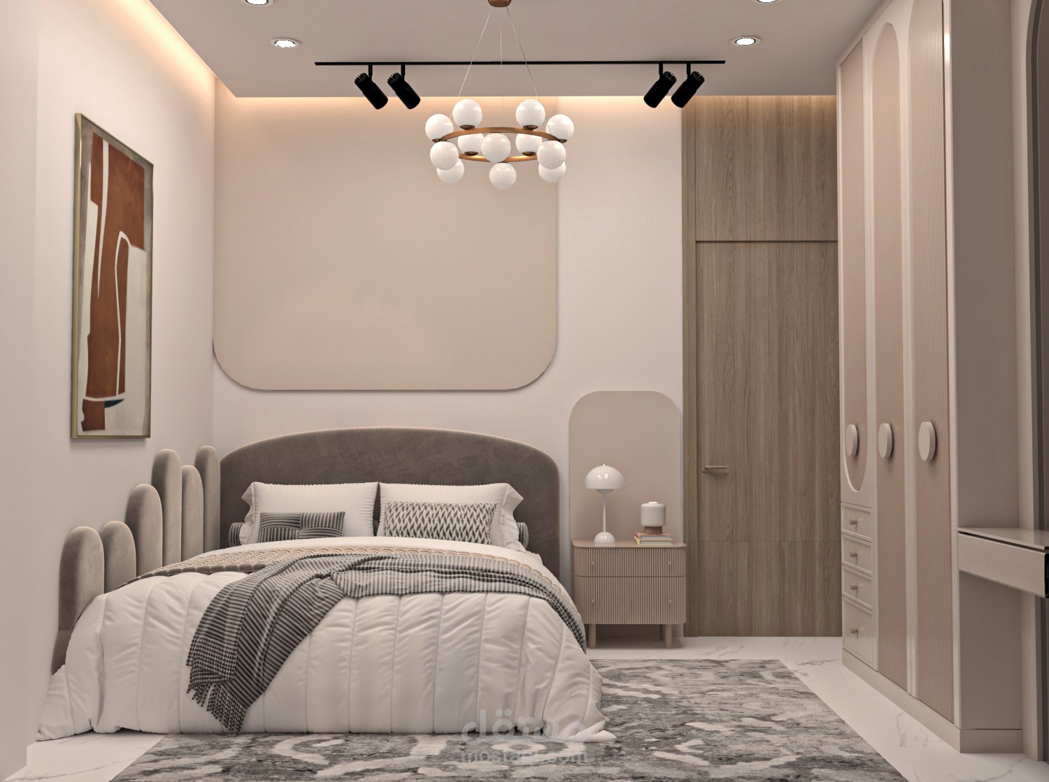 الجو العام للغرفة يوحي بـ الدفء والراحة مع لمسة فنية عصرية، تجعلها مثالية لغرفة نوم مريحة وأنيقة.