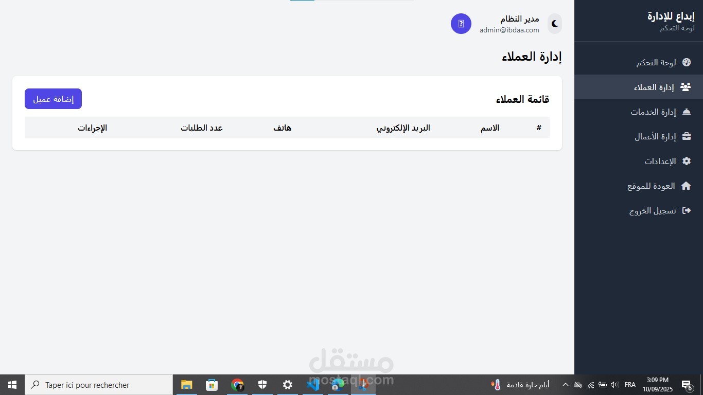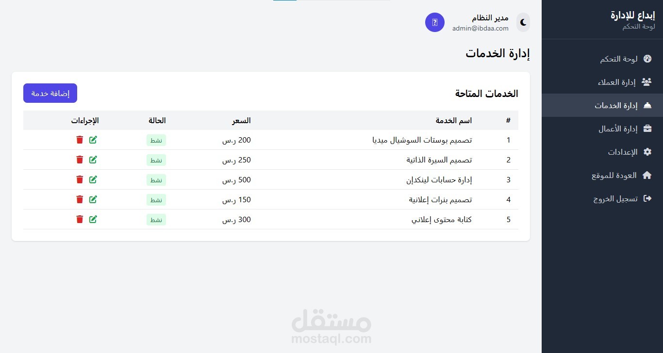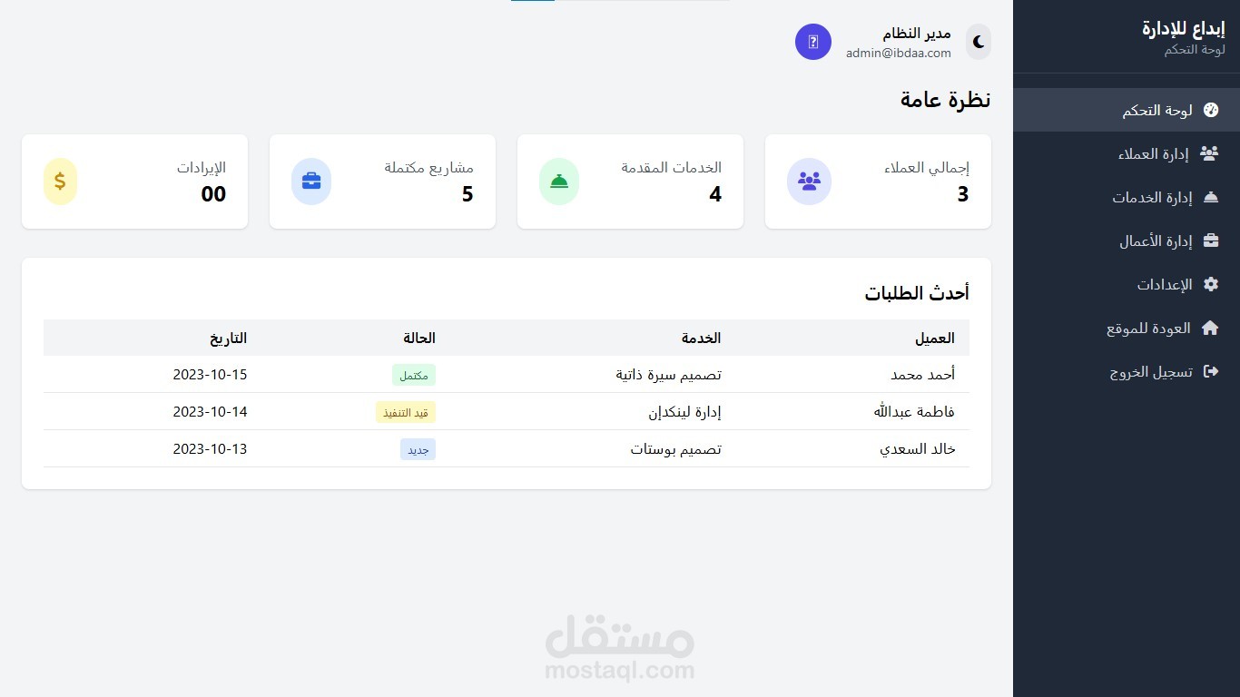 لوحة تحكم لإدارة العملاء، الخدمات، والمعاملات.