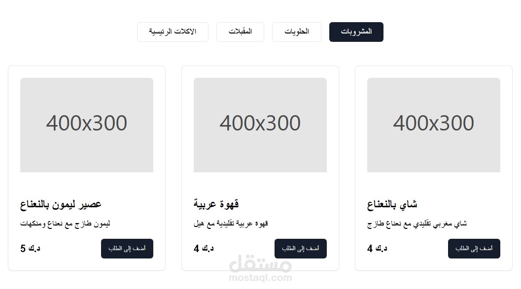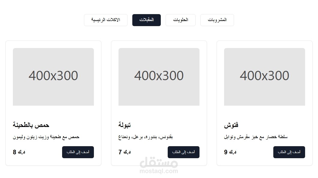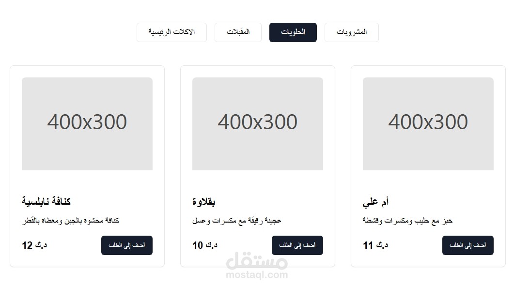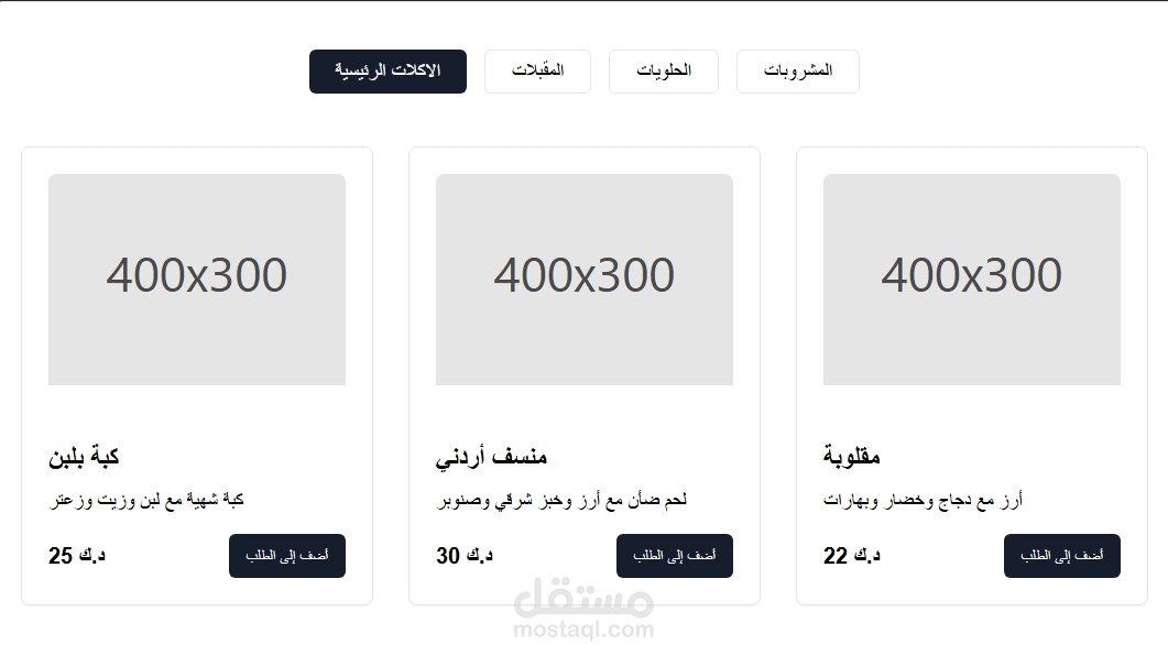 بطاقات (Cards) لكل طبق تحتوي على: صورة، اسم، وصف، وسعر.
