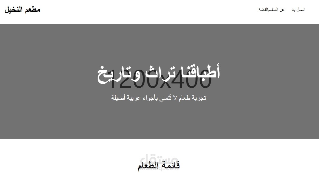 قائمة تنقل بسيطة تشمل: القائمة، عن المطعم، اتصل بنا.
