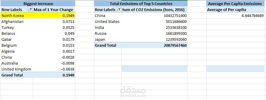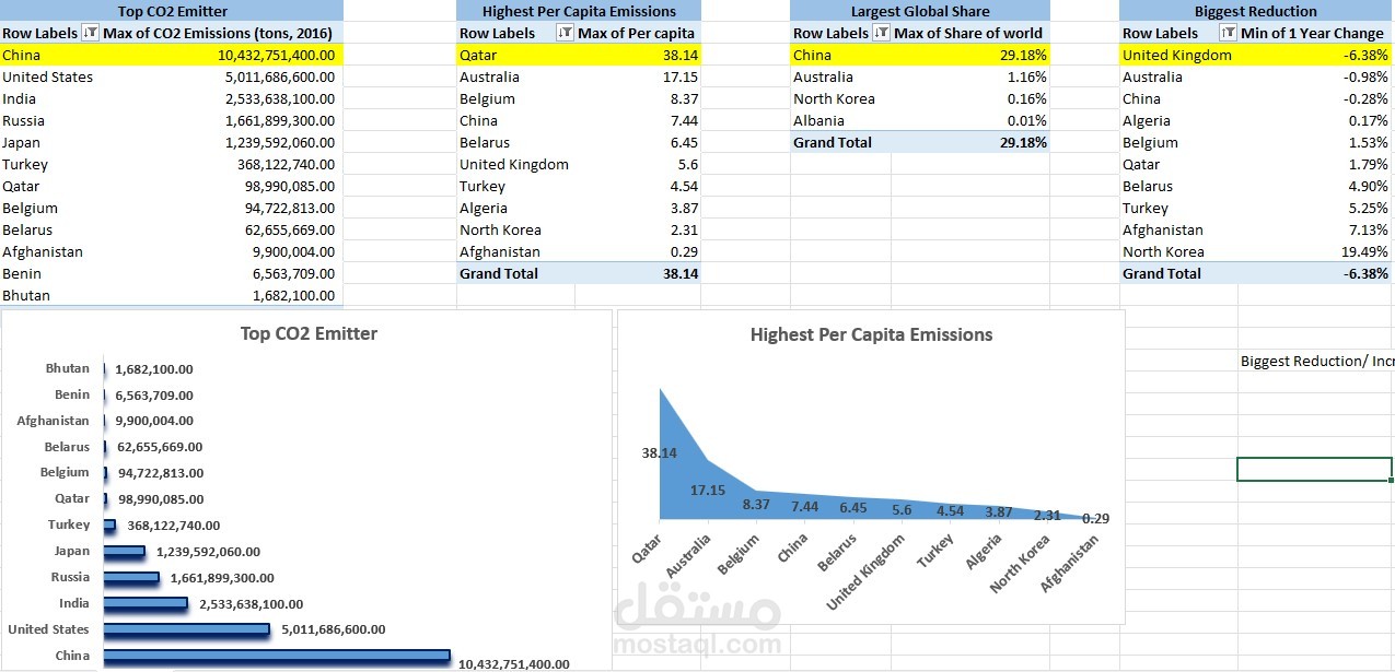 قمتُ بتصميم وتطوير لوحة معلومات تفاعلية في Excel لعرض وتحليل بيانات انبعاثات ثاني أكسيد الكربون (CO2) حسب الدولة. تتميز اللوحة بوجود مؤشرات أداء رئيسية ورسوم بيانية متنوعة مثل أعلى الدول إصدارًا للانبعاثات، نصيب الفرد، الحصة العالمية، والتغير السنوي، مما يسهّل فهم البيانات واتخاذ قرارات مبنية على تحليل دقيق. تم تنفيذ العمل من خلال جمع البيانات وتنظيفها ثم استخدام أدوات Excel (Pivot Tables, Charts, Slicers) لبناء لوحة تفاعلية احترافية تساعد في استكشاف المعلومات بسرعة وسهولة.