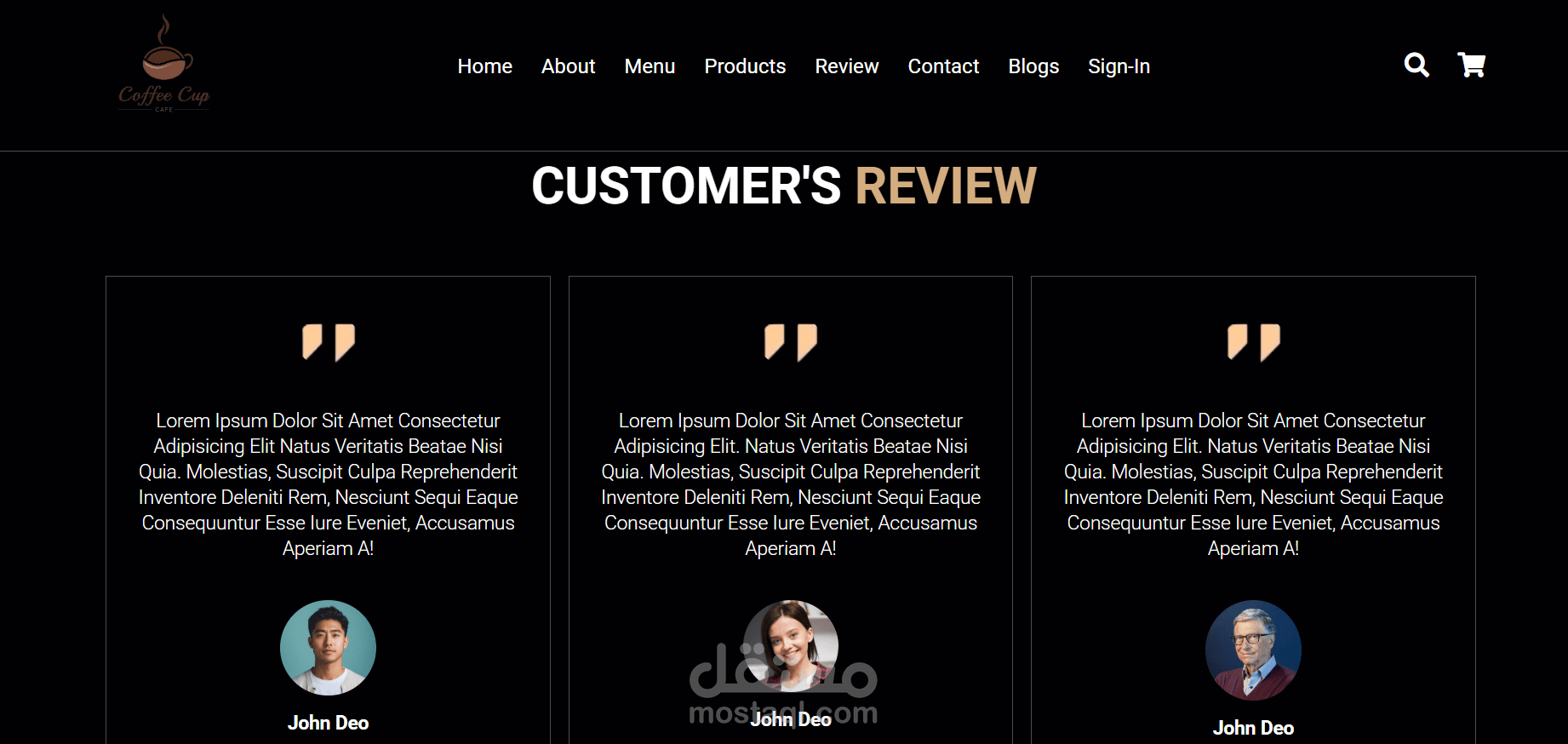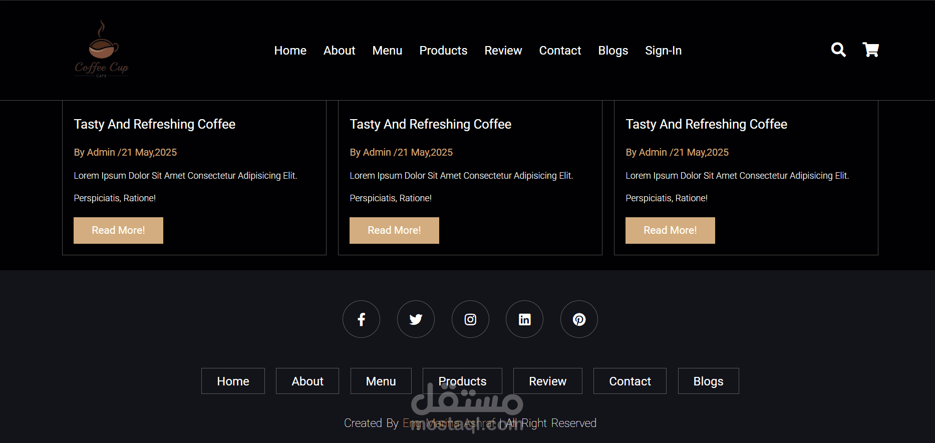 كما يضم الموقع صفحة التقييمات (Review) التي تتيح للعملاء مشاركة تجاربهم، وصفحة عنّا (About) لتعريف الزوار بالقصة والرؤية الخاصة بالمشروع. تم تصميم الموقع بأسلوب جذاب وسهل الاستخدام، مع التركيز على تجربة المستخدم وسلاسة التنقل بين الصفحات.