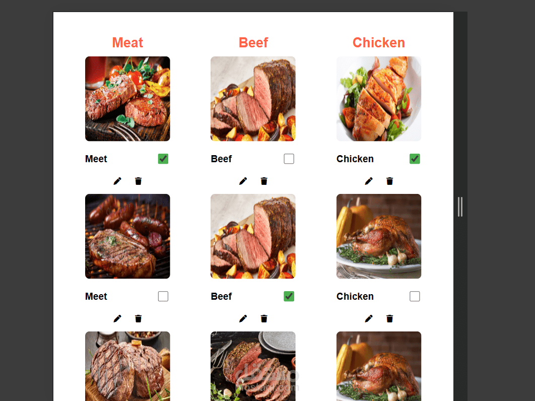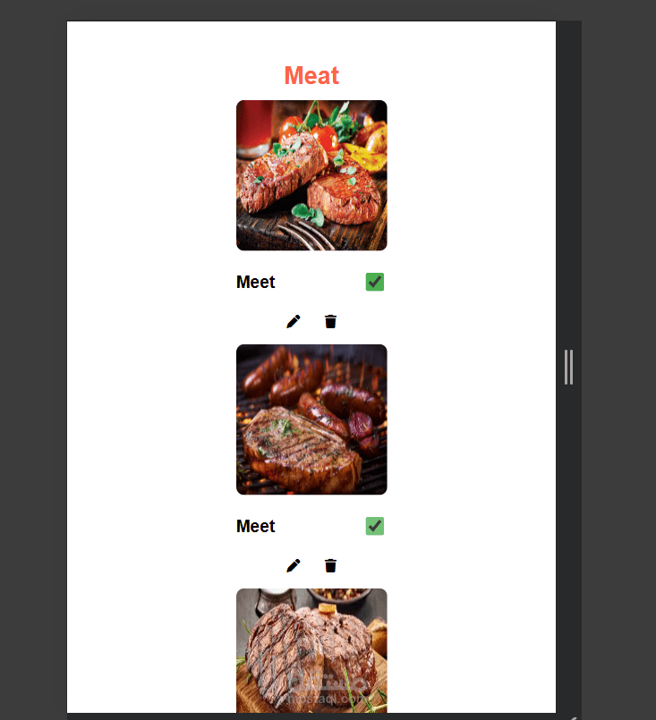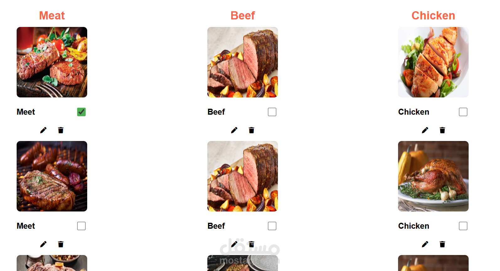 قمت بتصميم Shopping Cart منظمة تحتوي على عدة أقسام رئيسية مثل: اللحوم (Meat)، الفراخ (Chicken)، والبيف (Beef). تحت كل قسم يتم عرض العناصر المضافة بشكل مرتب مع إمكانية التعديل أو الحذف بسهولة.