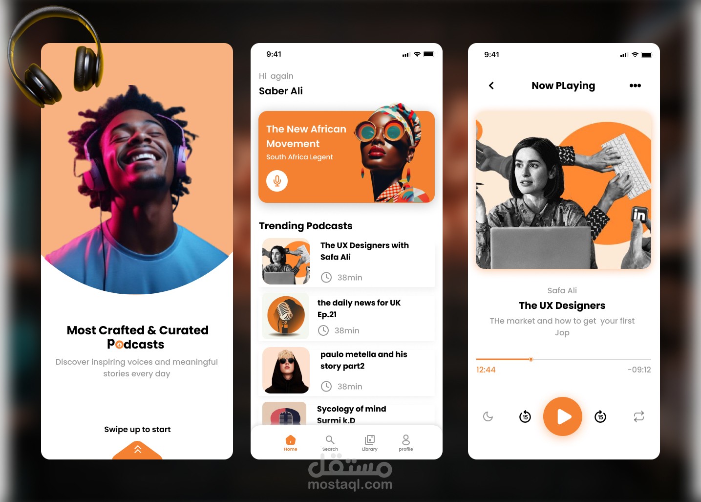 تم تصميم واجهات التطبيق ده علشان تقدم تجربة سلسة وممتعة لعشاق البودكاست. ركزت في تصميمي على إنه يكون بسيط، عصري، وسهل في الاستخدام لكل الفئات.