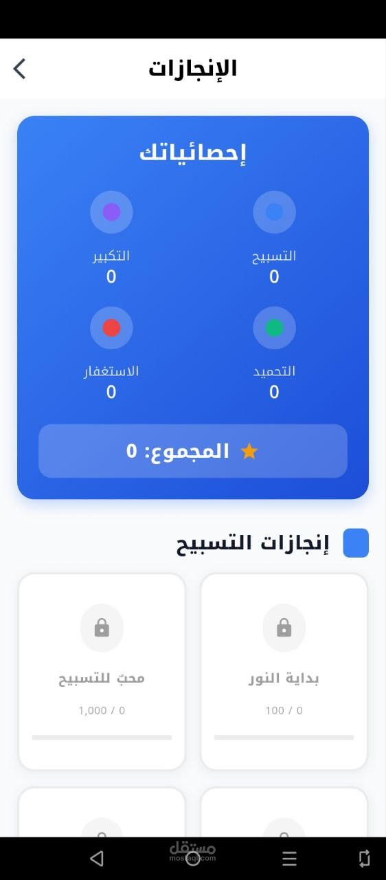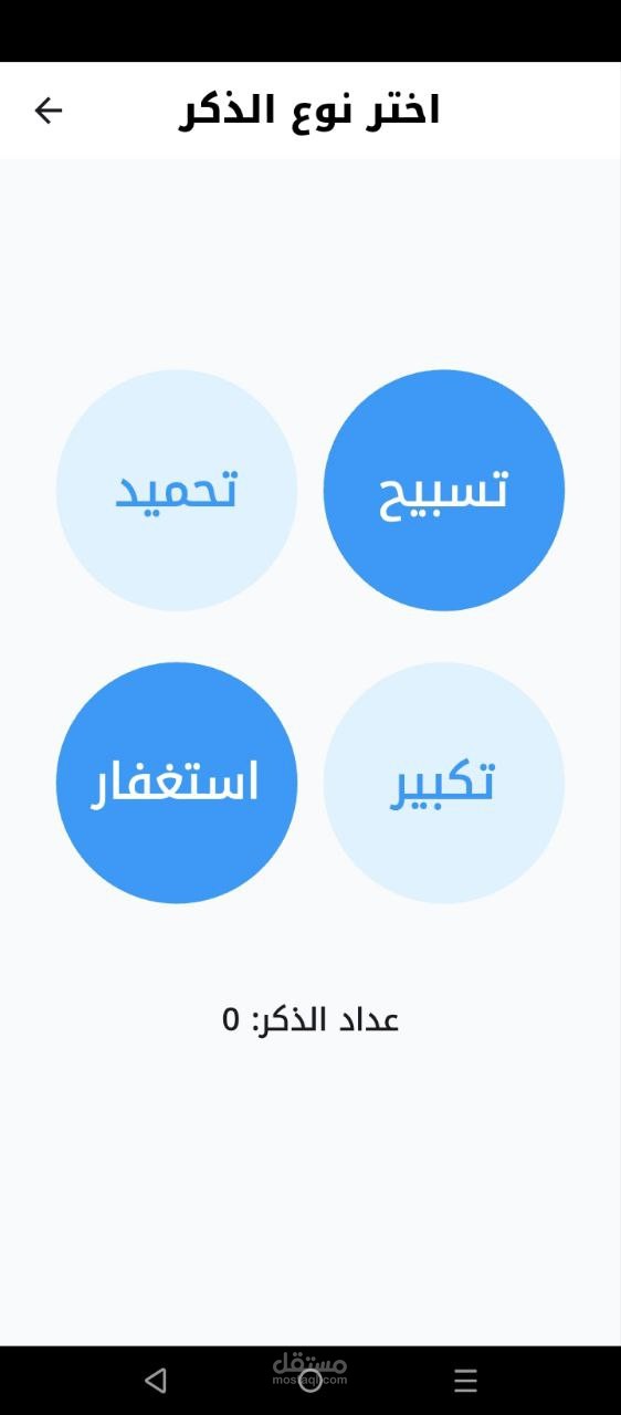 واجهة رئيسية تحتوي على الأذكار الأساسية (تسبيح – تحميد – تكبير – استغفار).