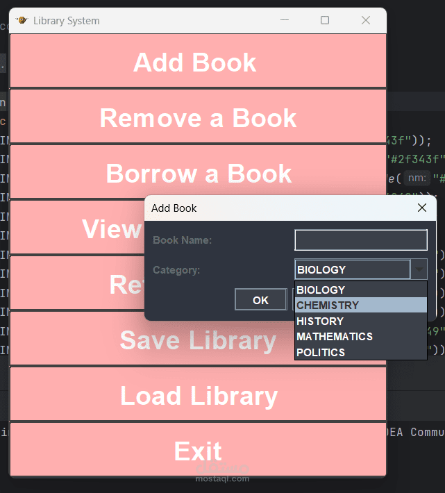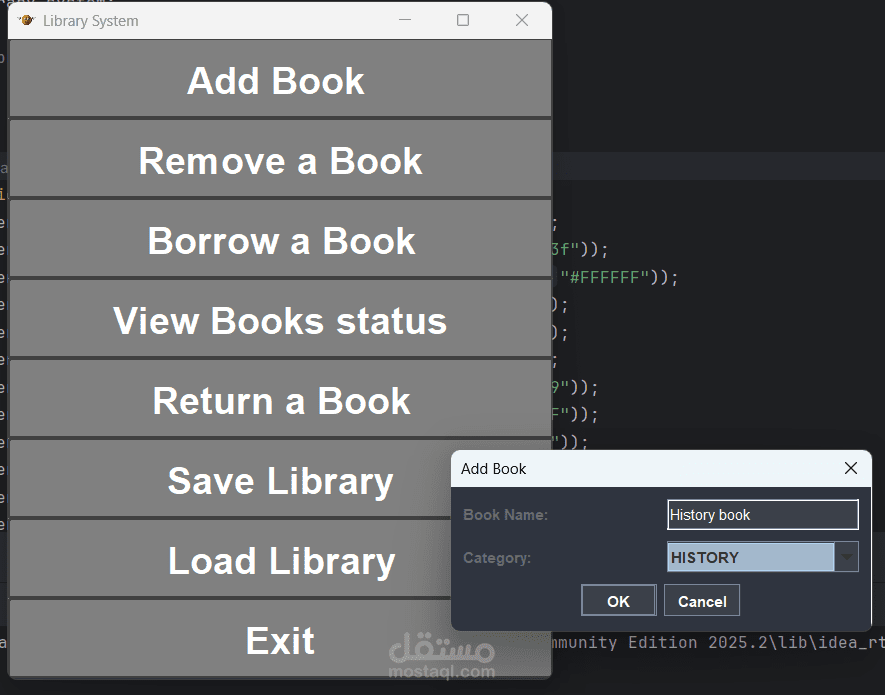 واجهة رسومية (Swing): واجهة تفاعلية تتيح للمستخدم إضافة، إزالة، استعارة، إرجاع، وعرض الكتب، بالإضافة إلى حفظ أو تحميل المكتبة.