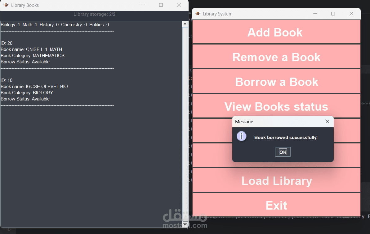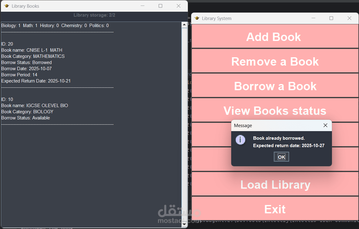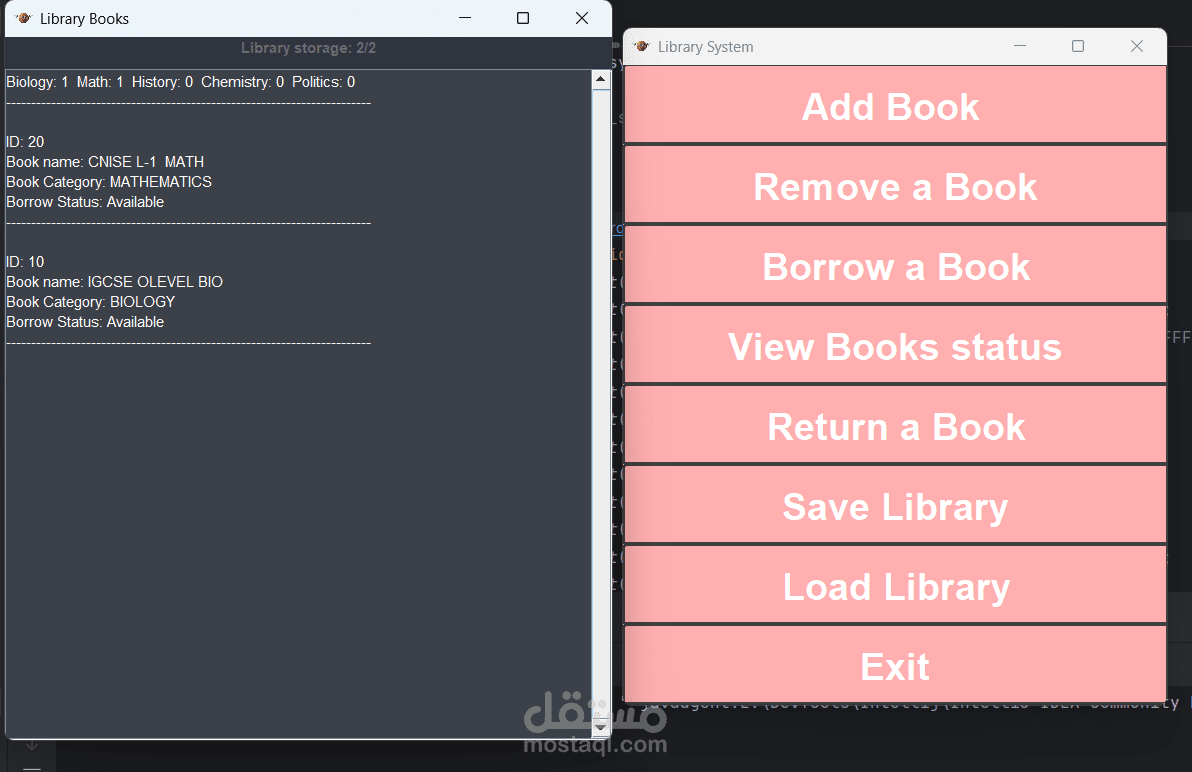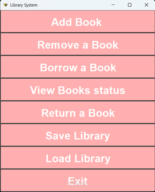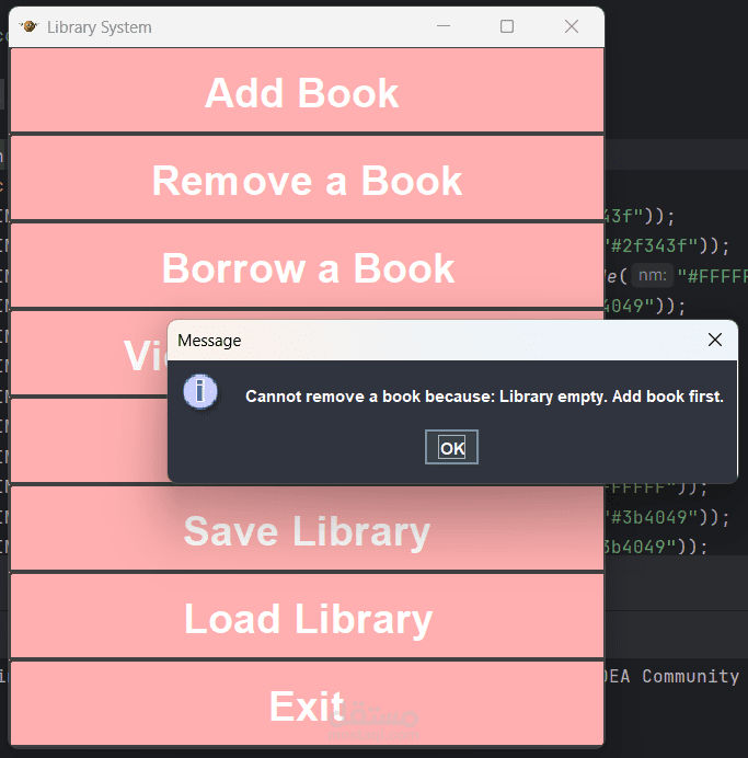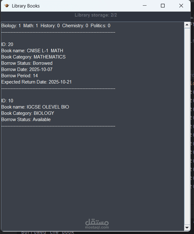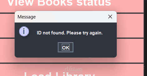 ملاحظــة: كنتُ مسؤولًه عن تطوير الجزء الخلفي (Back-End) بالكامل بما في ذلك تصميم الكلاسات، منطق الاستعارة والإرجاع، وتوليد المعرفات، بالإضافة إلى الاستثناءات ومعالجة الأخطاء — باستثناء ميزة حفظ واسترجاع الملفات التي قام بتطويرها أحد زملائي. أما الواجهة الأمامية (Front-End) فقد كانت من مسؤولية باقي أعضاء الفريق.