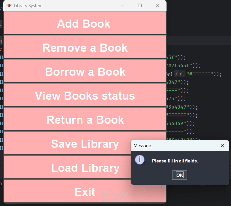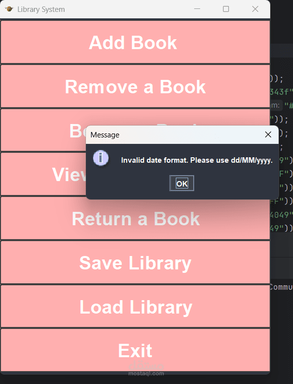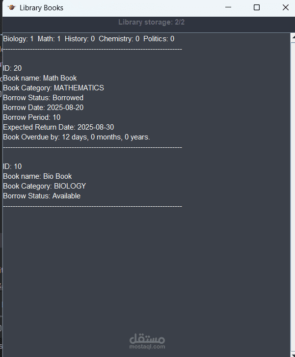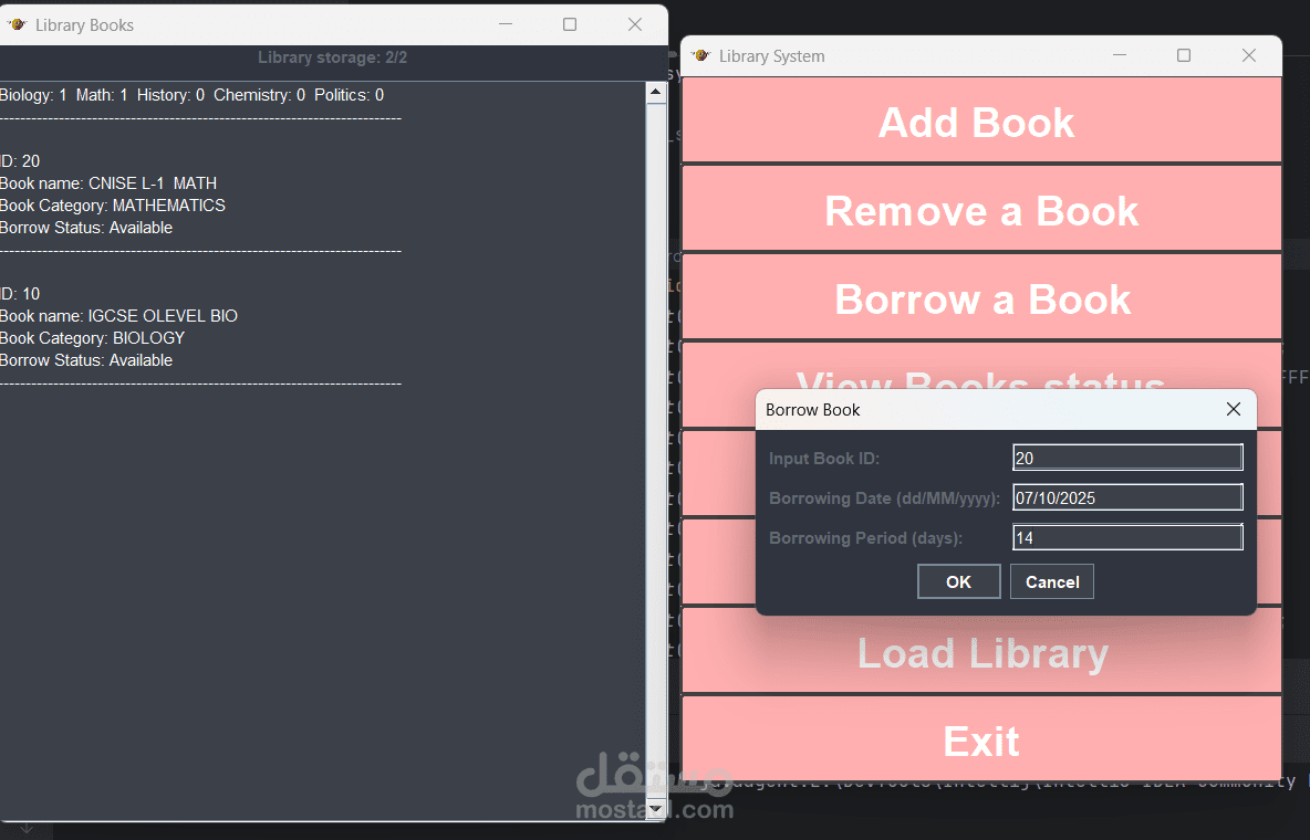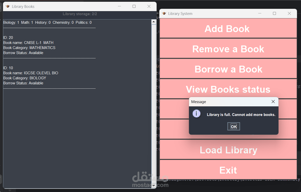 ملاحظــة: كنتُ مسؤولًه عن تطوير الجزء الخلفي (Back-End) بالكامل بما في ذلك تصميم الكلاسات، منطق الاستعارة والإرجاع، وتوليد المعرفات، بالإضافة إلى الاستثناءات ومعالجة الأخطاء — باستثناء ميزة حفظ واسترجاع الملفات التي قام بتطويرها أحد زملائي. أما الواجهة الأمامية (Front-End) فقد كانت من مسؤولية باقي أعضاء الفريق.