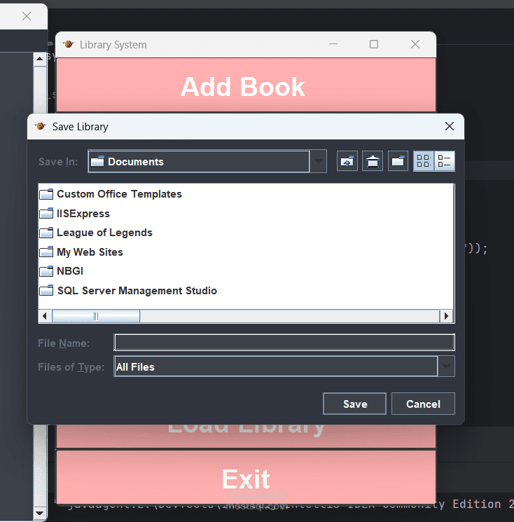 Graphical User Interface (Swing): User-friendly interface with buttons to add, borrow, return, remove, and view books, as well as save and load the library.