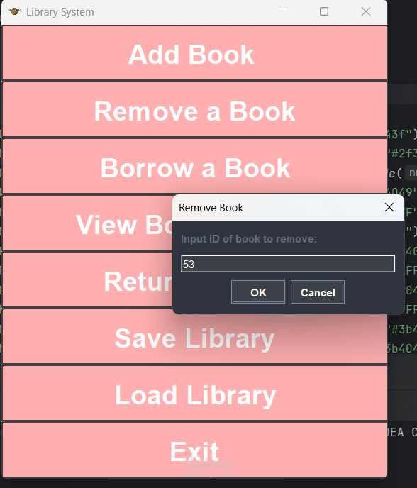 Note: I was responsible for developing the entire backend of the project — including class design, borrowing/returning logic, ID generation, and exception handling — except for the file saving and retrieval functionality, which was implemented by a teammate. The frontend (Swing GUI) was handled by my colleagues.