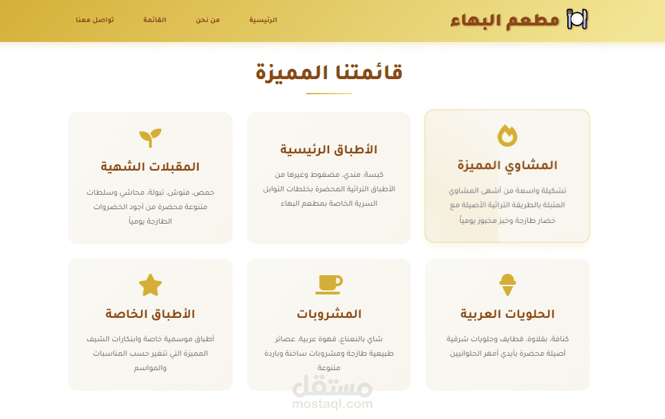 قمت بتصميم وتطوير واجهة كاملة لموقع مطعم "البهاء"، وهو مطعم يقدم وجبات شرقية وغربية. تم تنفيذ التصميم بأسلوب عصري وجذاب يركز على تحسين تجربة المستخدم من خلال استخدام الألوان الدافئة، الصور عالية الجودة، والحركة السلسة (Animations) لإضفاء لمسة احترافية ومميزة على الموقع.