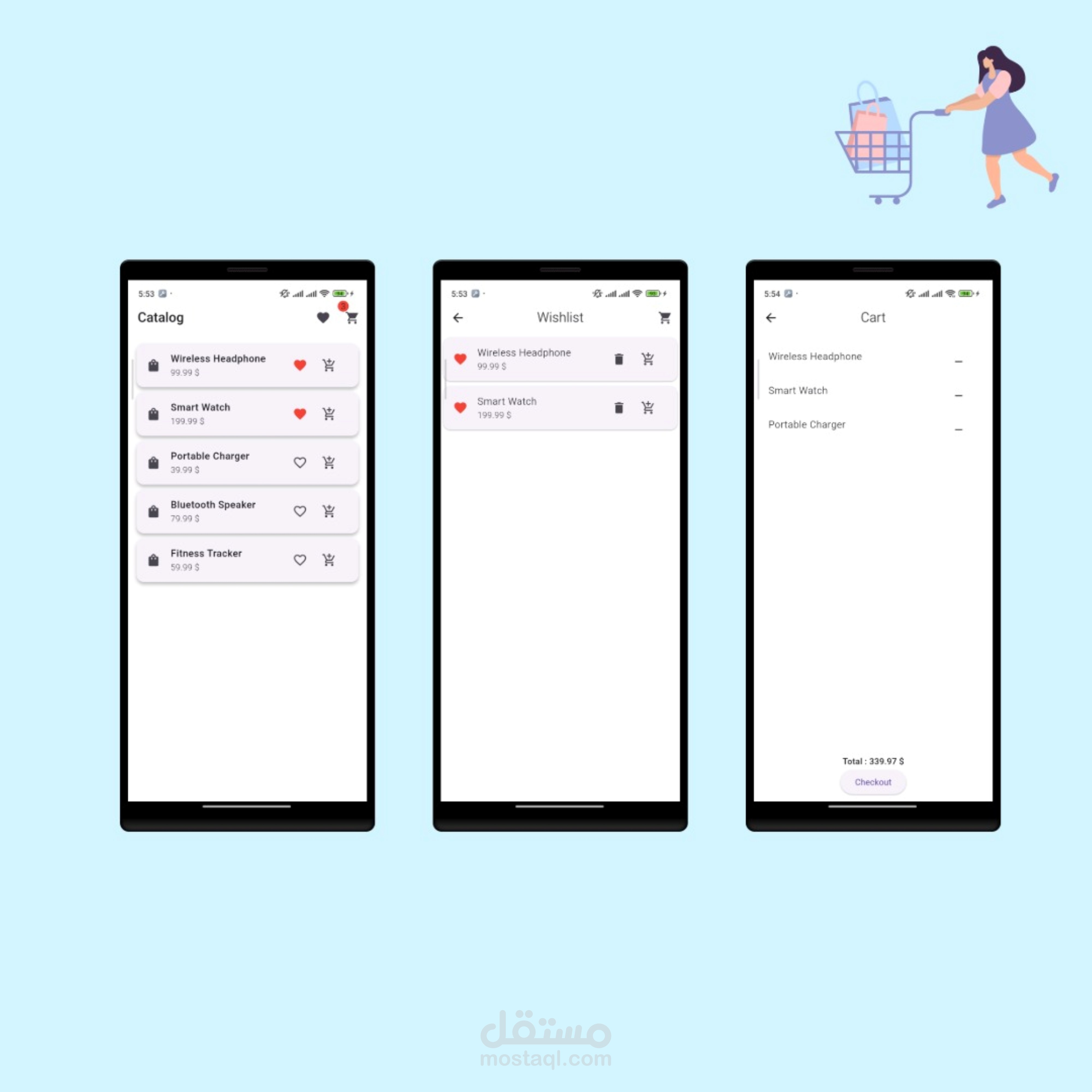 A catalog application that allows users to browse a well-structured product list, add items to a wishlist or shopping cart, and track the number of items in the cart in real-time. Users can also view the total order price and complete the checkout process with ease.
