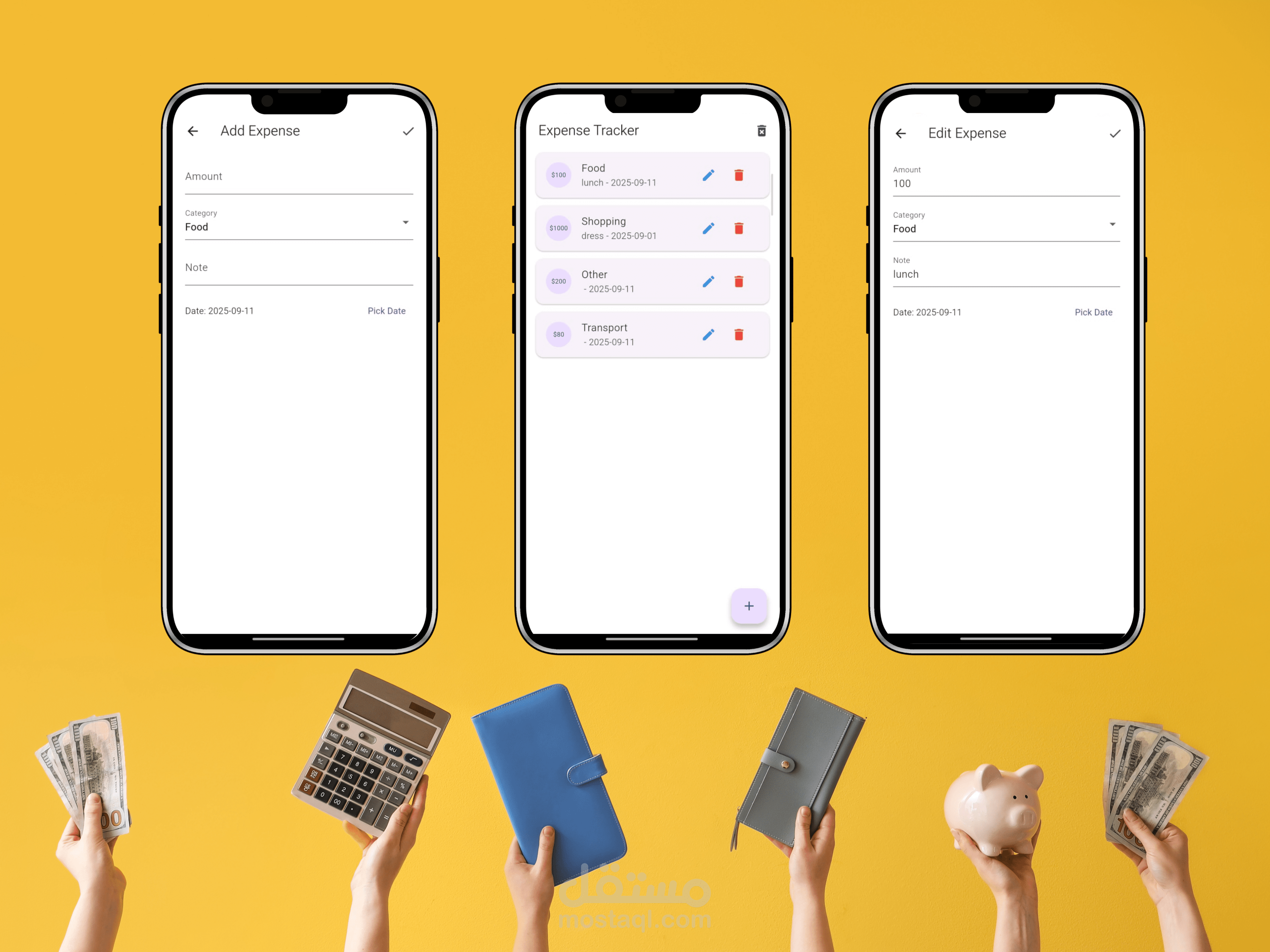 A mobile app designed to help users keep track of their daily expenses in an organized way. Users can add a new expense by entering the amount, selecting a category (such as food, transport, or shopping), adding notes, and choosing a date.
