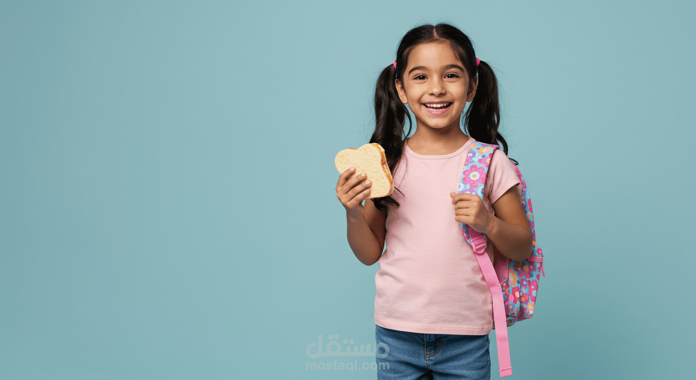المعالجة البصرية: دمج صورة الطفلة مع الخلفية بشكل واقعي باستخدام تقنيات القص والمعالجة اللونية.