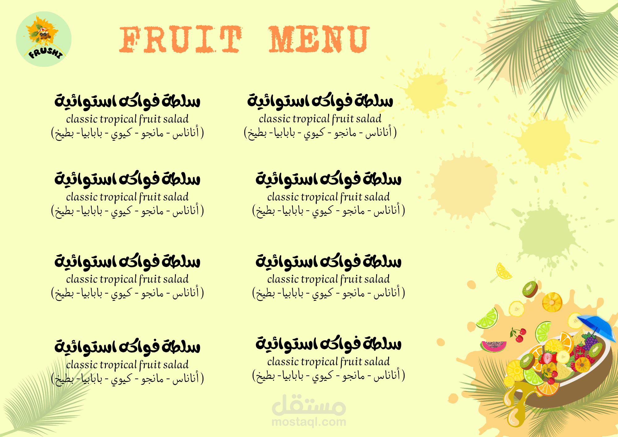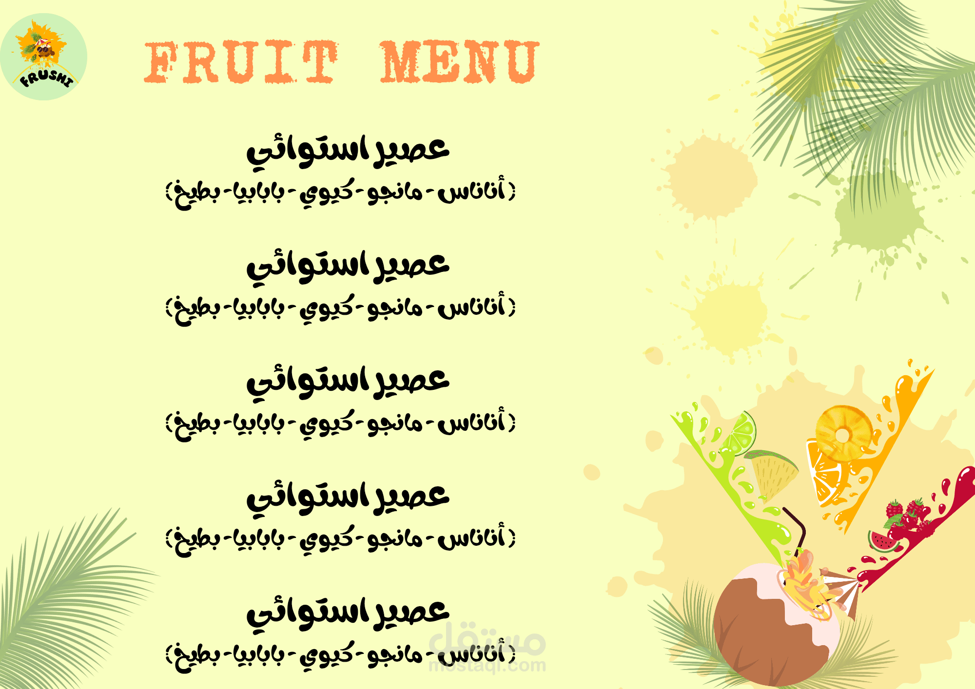 قمت بتصميم منيو عصري لسلطات الفواكه يتميز بألوان مشرقة وحيوية تعكس طابع المنتجات الطبيعية والمنعشة. التصميم بسيط وأنيق مع لمسات عصرية تبرز جمال الصور وتجعلها واضحة وجذابة للزبون.