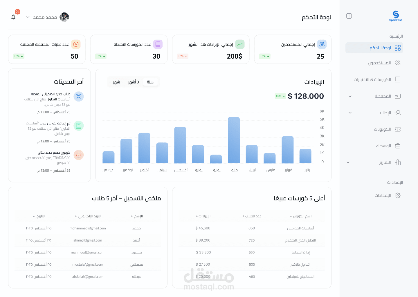 بصفتي مصمم UI/UX، قمت بتصميم لوحة تحكم بديهية ومركزة على المستخدم لمنصة دورة التداول، تم تصميمها لتحسين رحلة المتعلم. توفر اللوحة تجربة مستخدم سلسة، مع ميزات تتبع التقدم الشخصي، والوصول السهل إلى الدروس، والاختبارات، والموارد، جميعها ضمن واجهة نظيفة وجذابة بصريًا. مع التركيز على قابلية الاستخدام، ضمنت أن يكون التصميم ليس فقط وظيفيًا ولكن أيضًا محفزًا، مما يساعد المستخدمين على البقاء متحمسين ومنظمين طوال عملية تعلمهم.