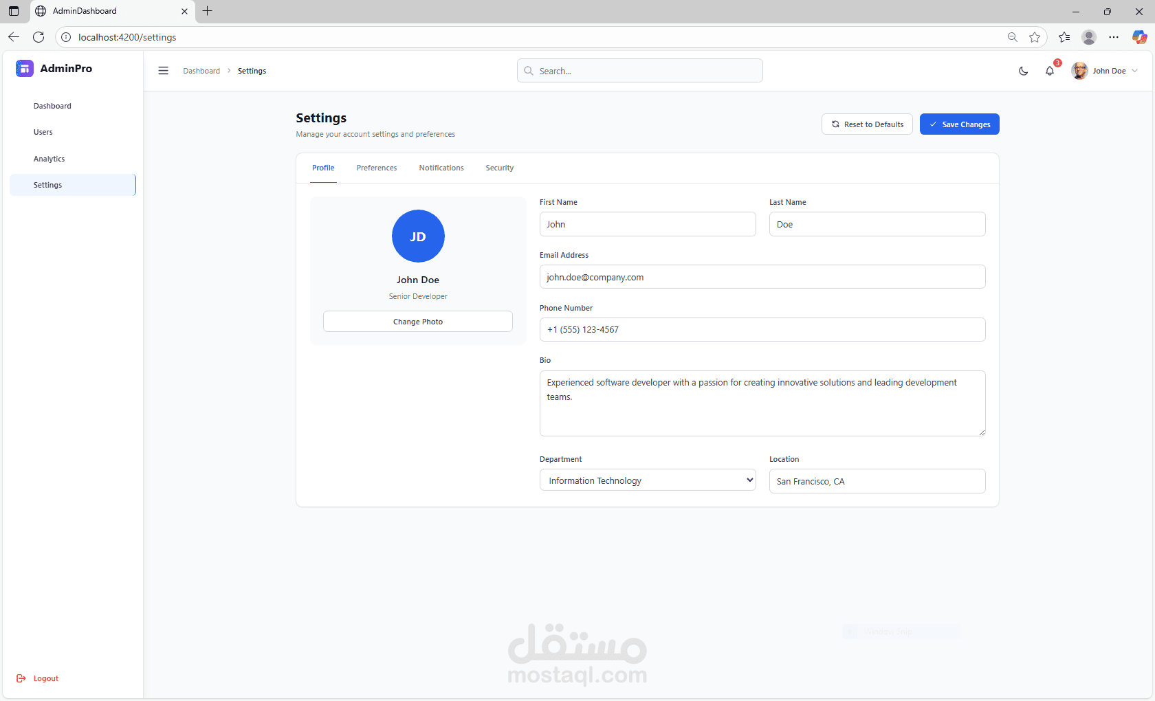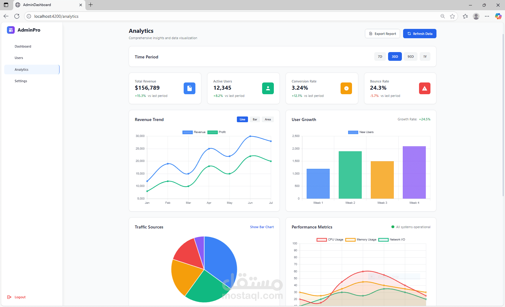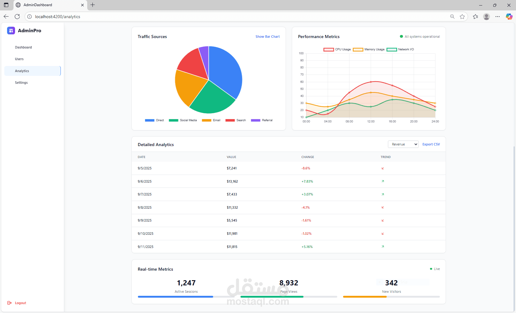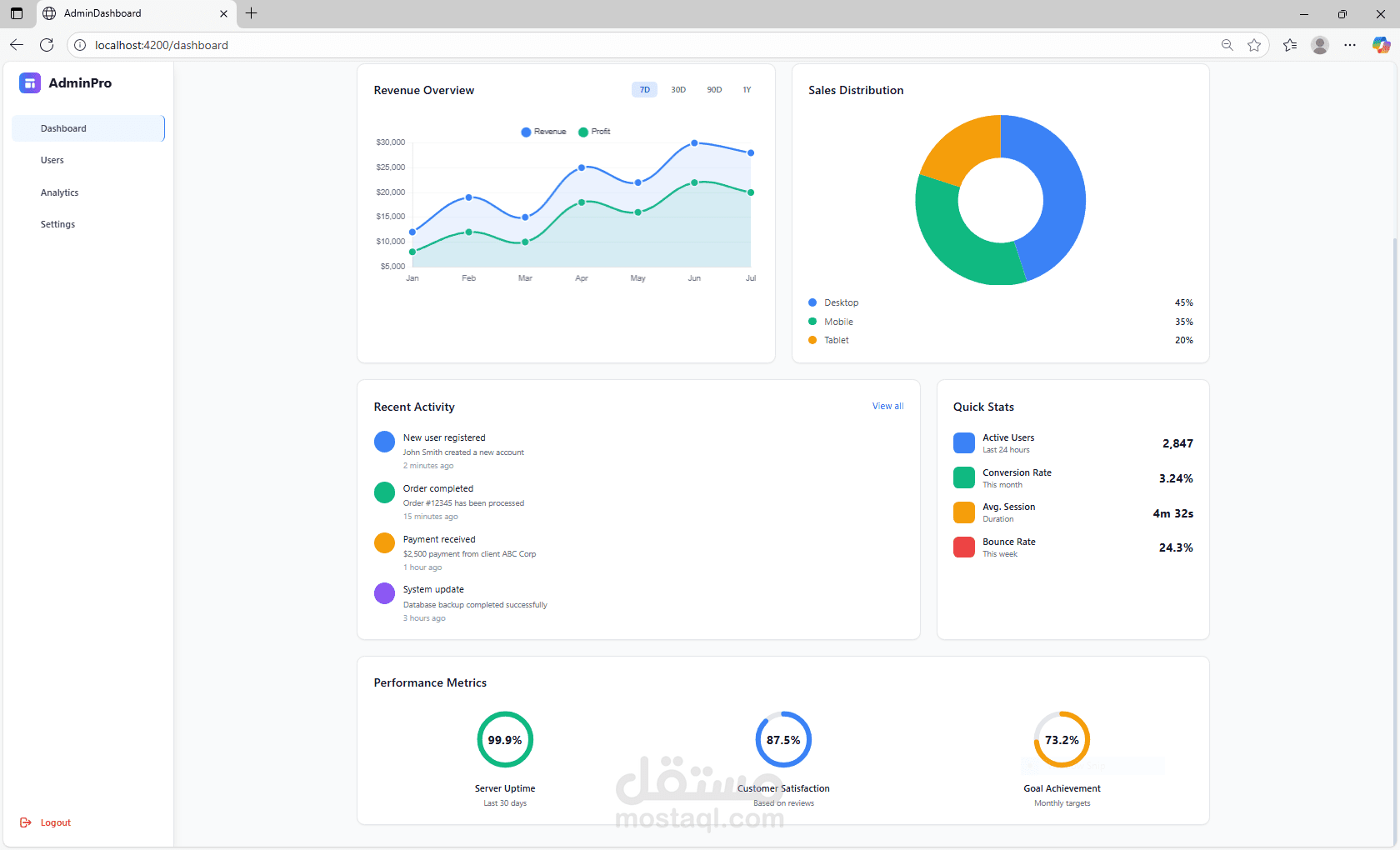 صفحة رئيسية للمؤشرات الهامة (Dashboard)، صفحة لإدارة المستخدمين (Users)، صفحة للتقارير والتحليلات (Analytics)، وصفحة للإعدادات (Settings).