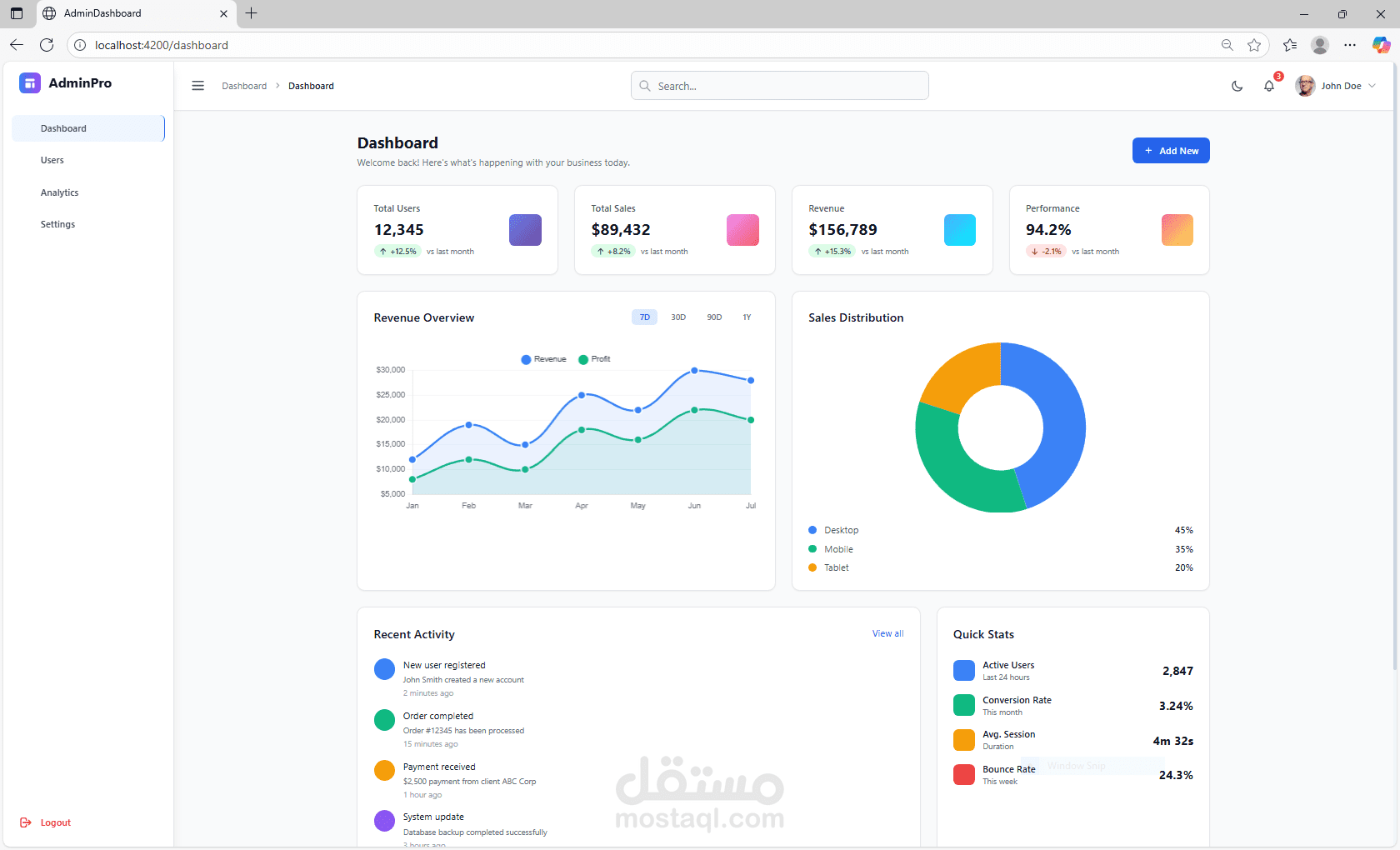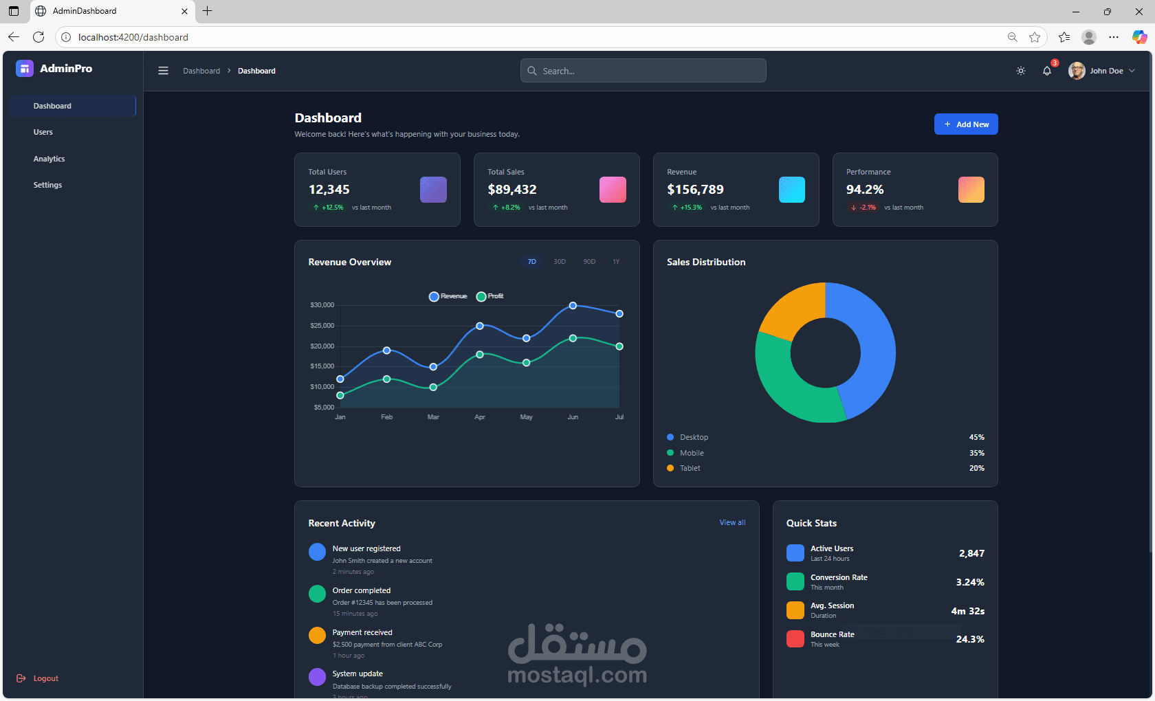 تقارير ورسوم بيانية: متابعة أداء عملك من خلال رسوم بيانية واضحة تعرض لك أهم الأرقام والإحصائيات (مثل أعداد المستخدمين أو الأرباح).