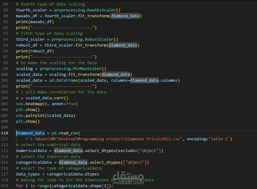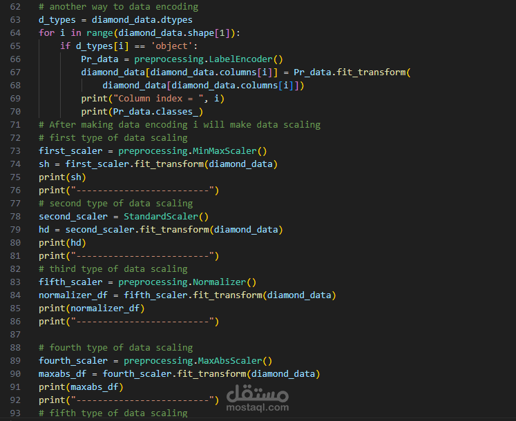 تقييس البيانات (Scaling): استخدام عدة طرق مثل MinMaxScaler، StandardScaler، RobustScaler، Normalizer، وMaxAbsScaler.