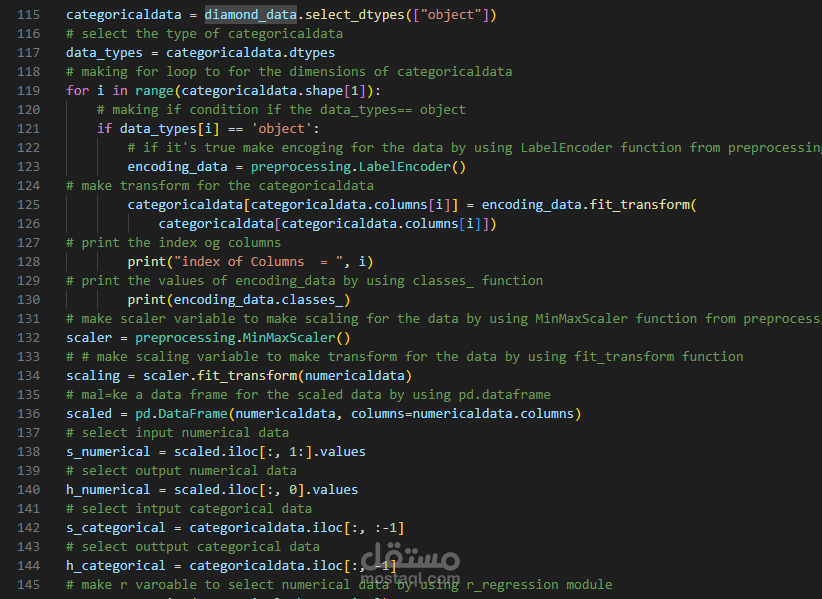 ترميز البيانات (Encoding): تحويل الأعمدة النصية إلى بيانات رقمية باستخدام طرق مثل Label Encoding.
