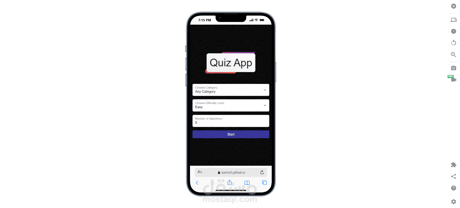 تخصيص الاختبار (Customization): يتيح للمستخدم اختيار "فئة الأسئلة" (Categories) وتحديد "مستوى الصعوبة" (Easy, Medium, Hard) قبل البدء، مما يعكس القدرة على تنظيم وهيكلة البيانات المعقدة.