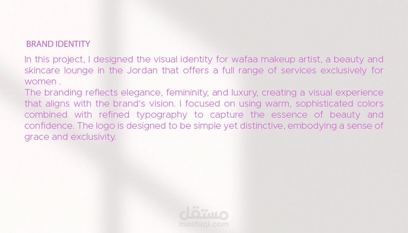 الشعار يعكس شخصية خبيرة التجميل: رقي – ثقة – لمسة إبداعية، ليترك انطباع أن كل إطلالة من إبداع وفاء هي فن متكامل.