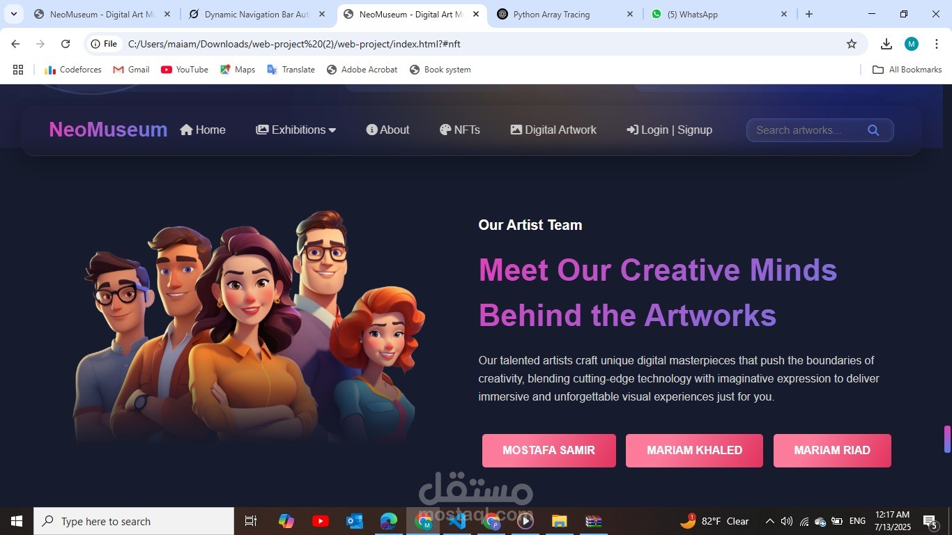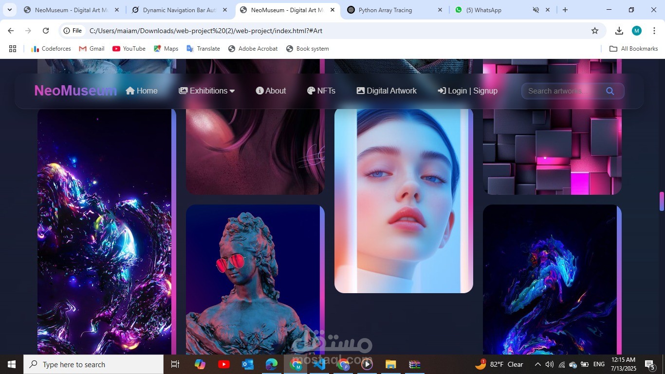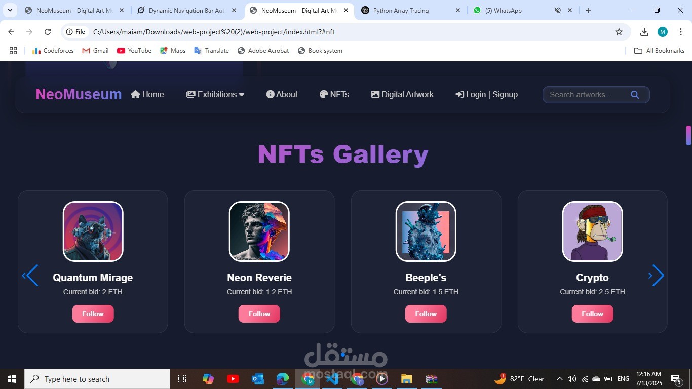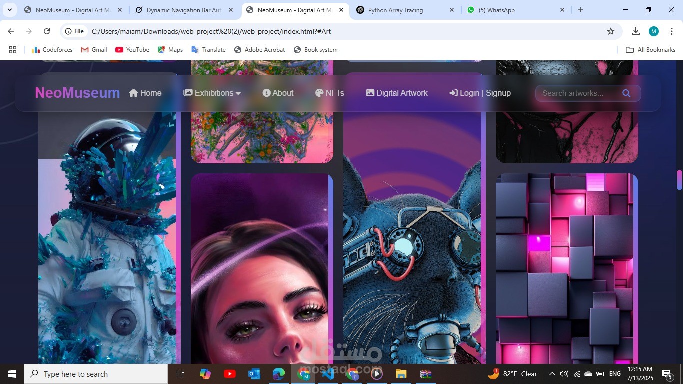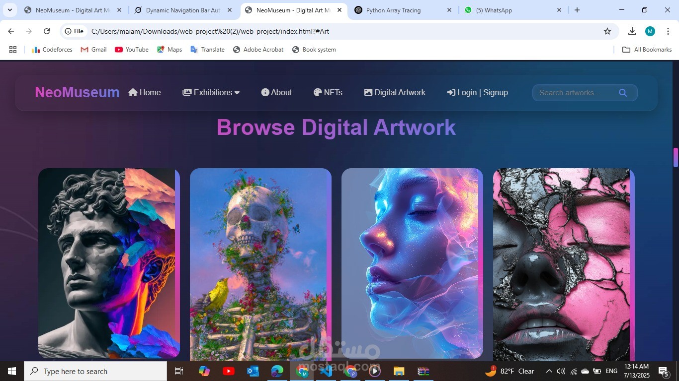 A designed and developed a responsive digital art museum website called NeoMuseum using HTML, CSS, and JavaScript. The website allows users to discover, collect, and showcase digital artworks and NFTs in a modern, visually appealing interface.