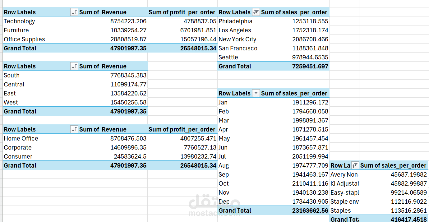 توزيع الإيرادات حسب المناطق (South – Central – East – West) باستخدام مخطط دائري.