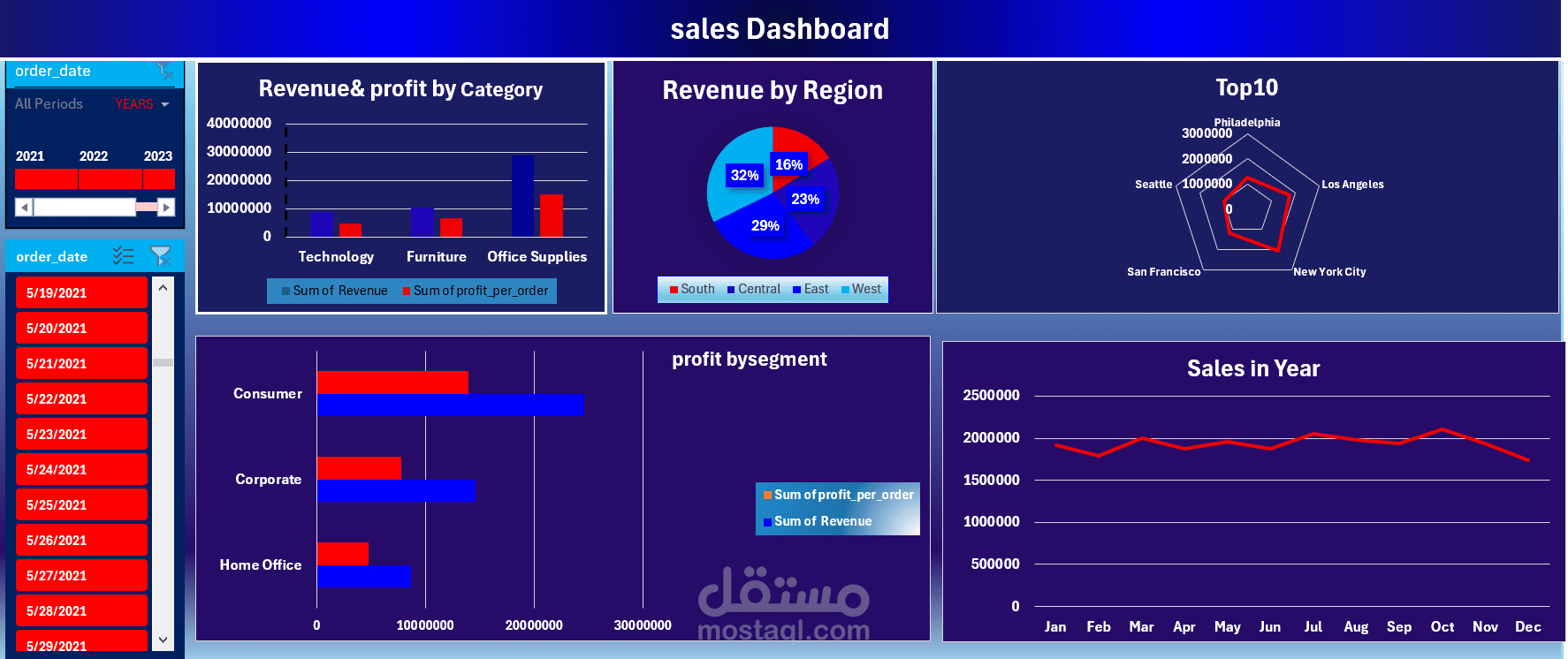 تم إنشاء لوحة معلومات (Dashboard) تفاعلية لعرض وتحليل بيانات المبيعات بطريقة سهلة وواضحة تساعد في اتخاذ القرارات. الـ Dashboard توضح الأداء عبر عدة أبعاد مثل الفئات، المناطق، القطاعات الزمنية، وأفضل العملاء.