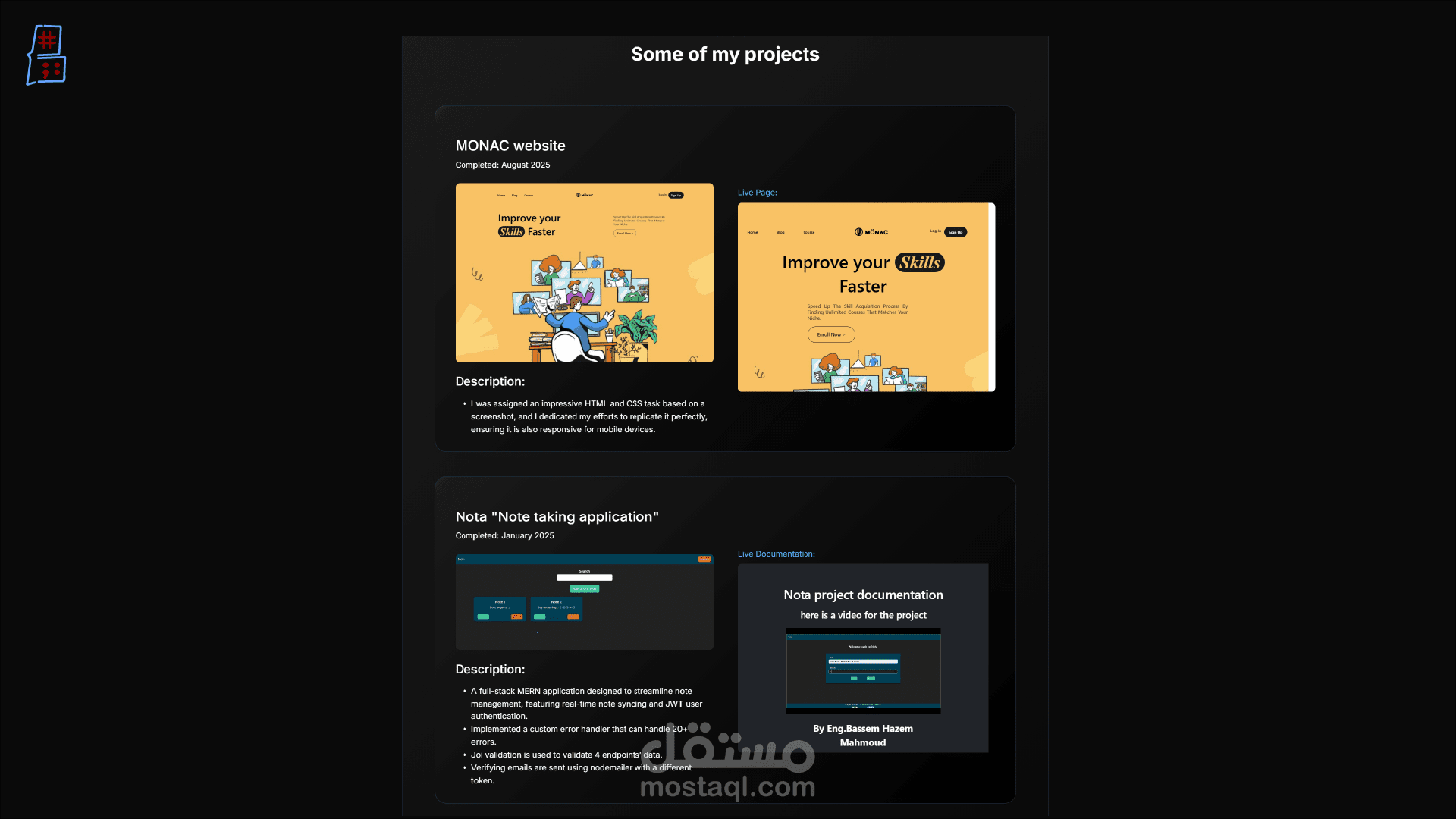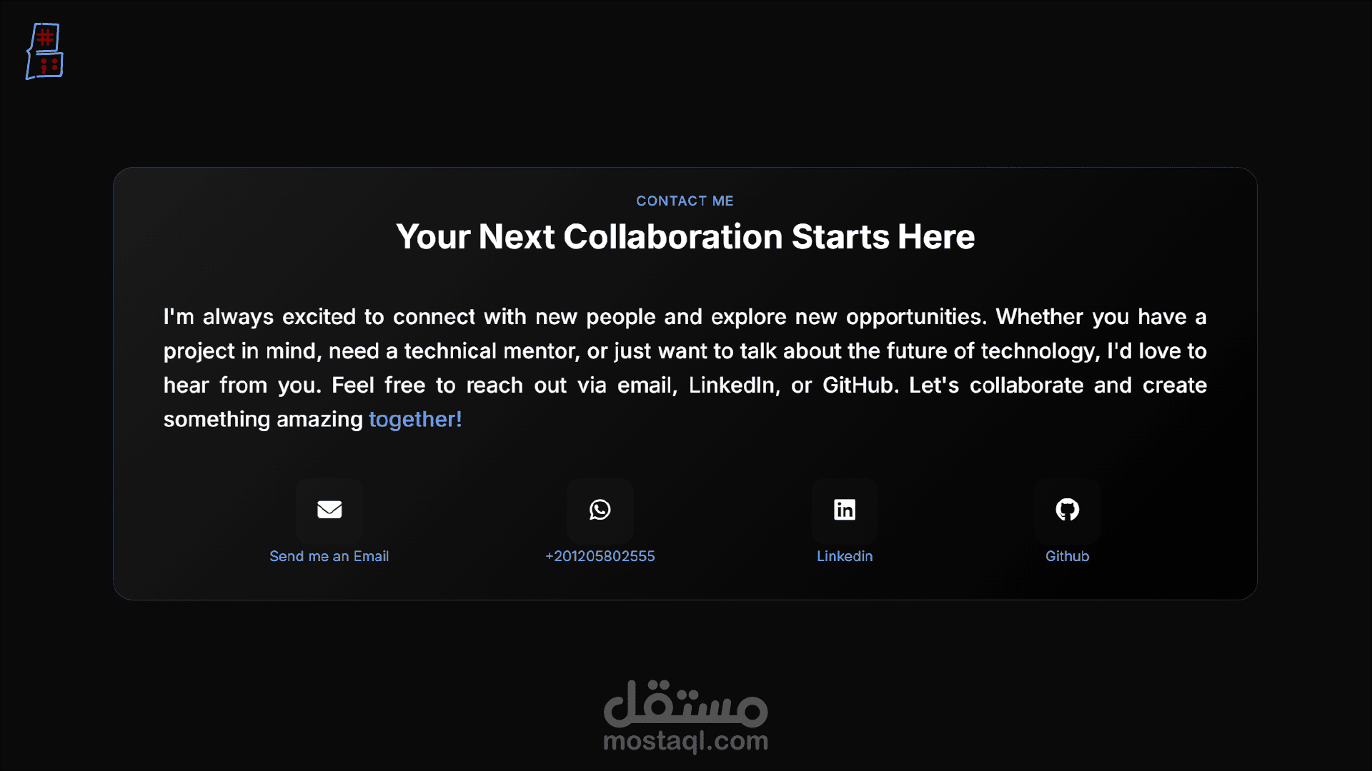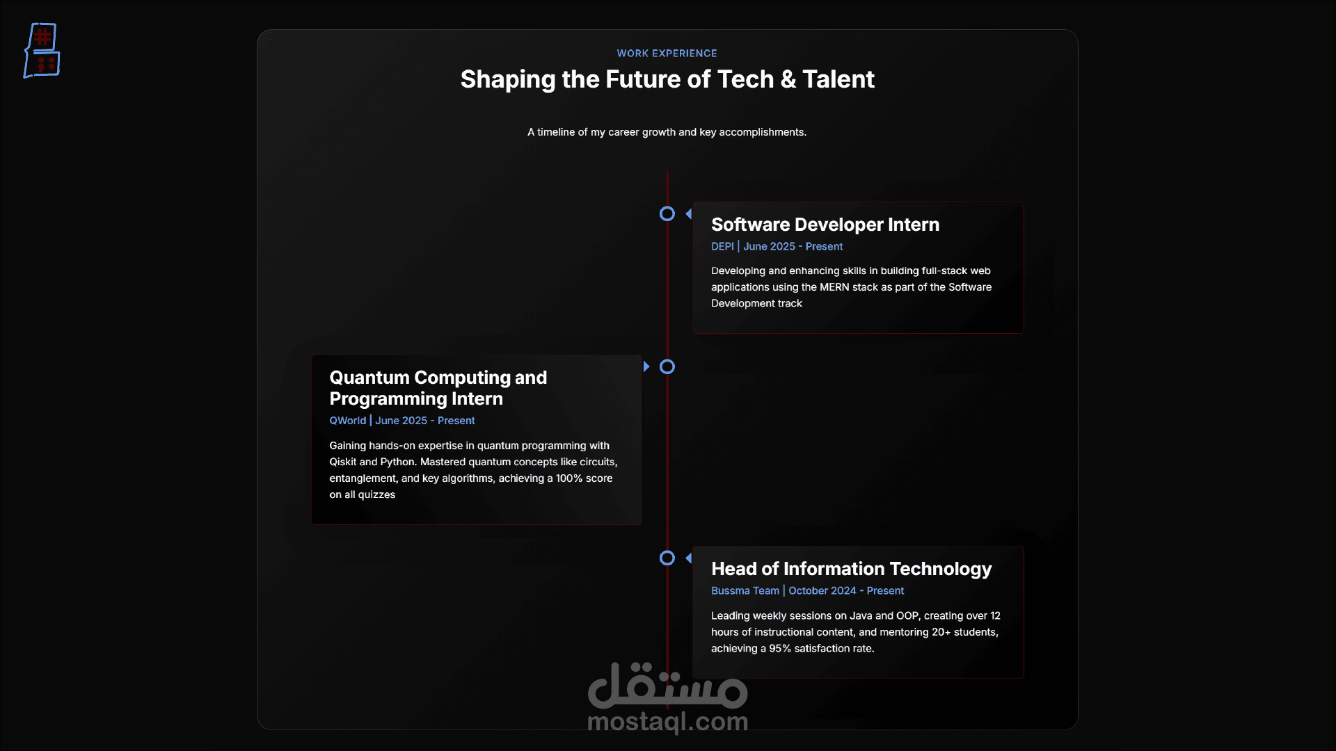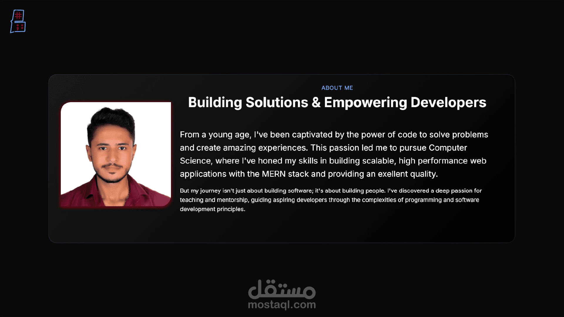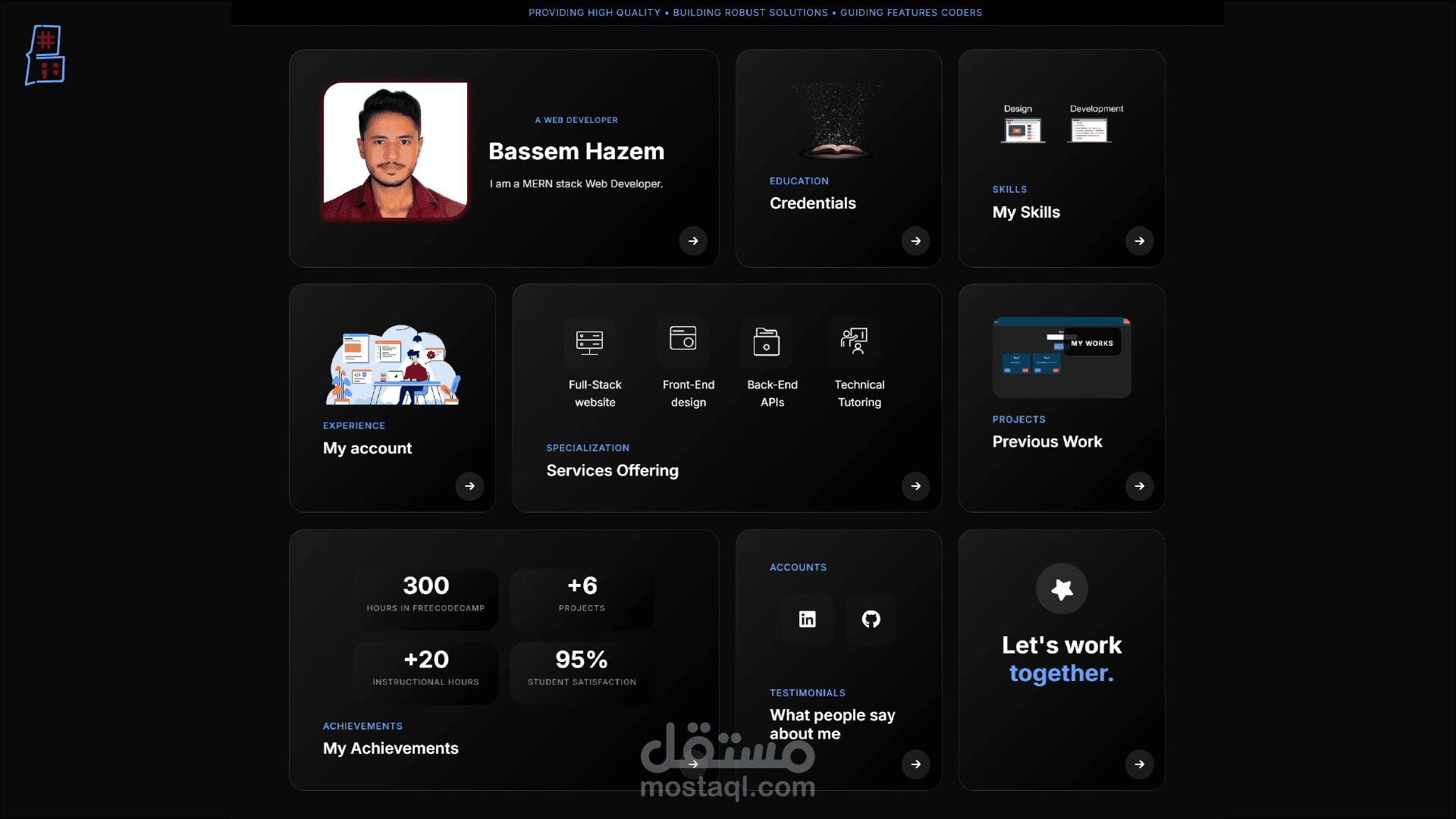 هذا المشروع هو موقعي الشخصي، وهو بمثابة ملف أعمال رقمي تم تصميمه وتطويره لعرض مهاراتي، خبراتي، ومشاريعي كمطور ويب. تم بناء الموقع بأحدث تقنيات الويب مع التركيز على تقديم تصميم نظيف ومتجاوب، وتجربة مستخدم تفاعلية تترك انطباعًا إيجابيًا واحترافيًا لدى العملاء ومديري التوظيف.