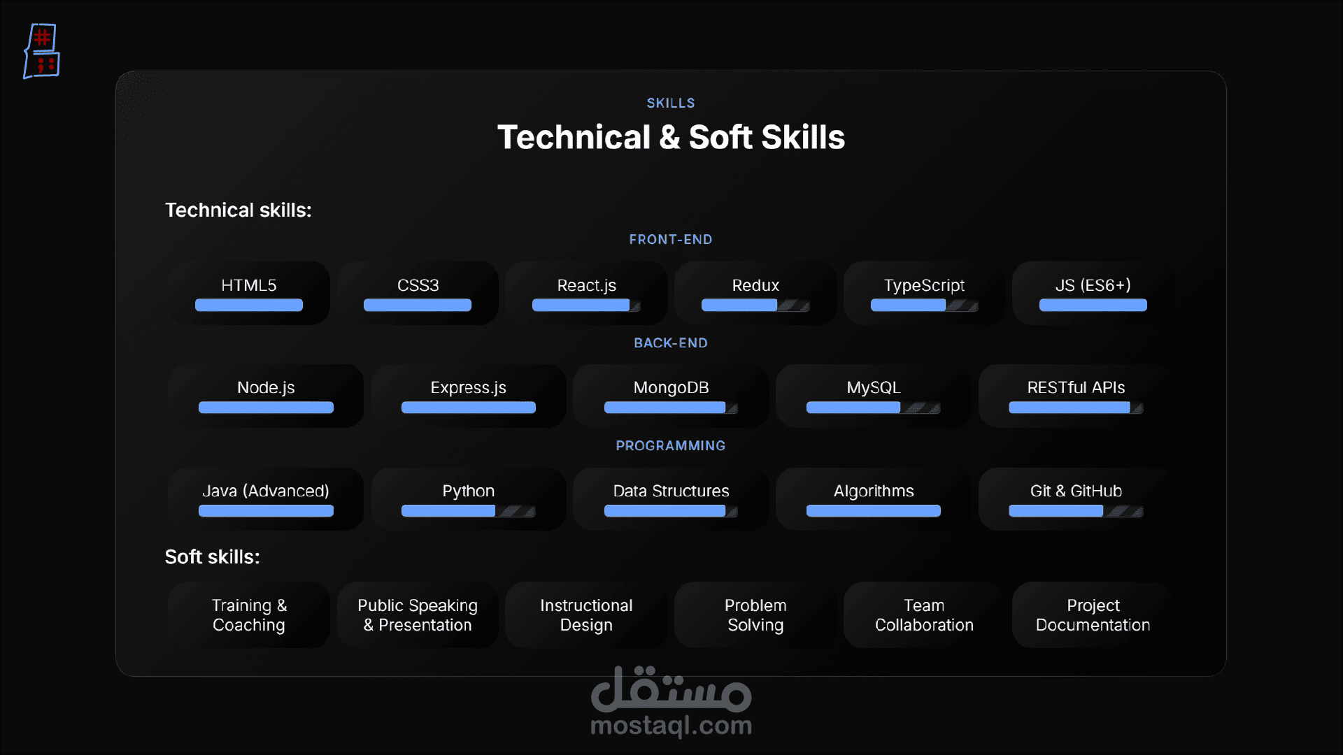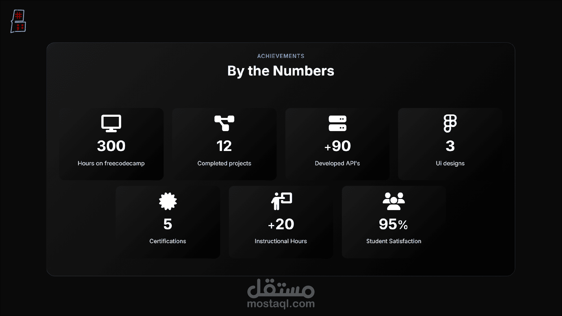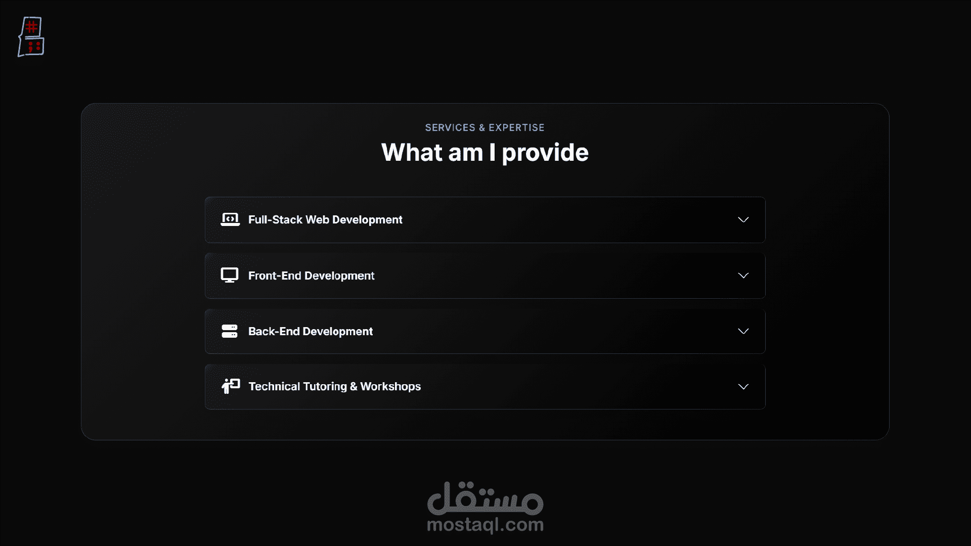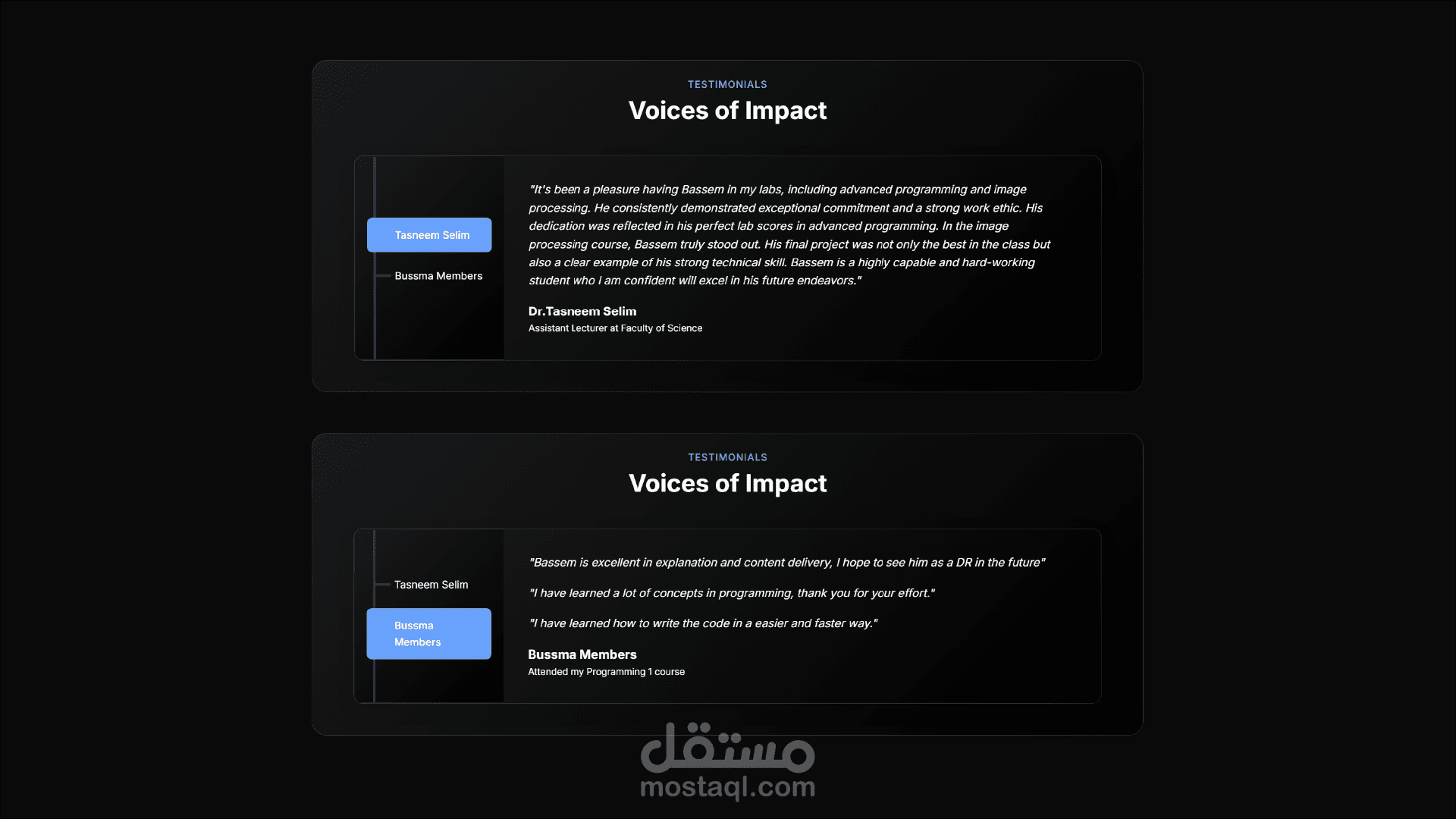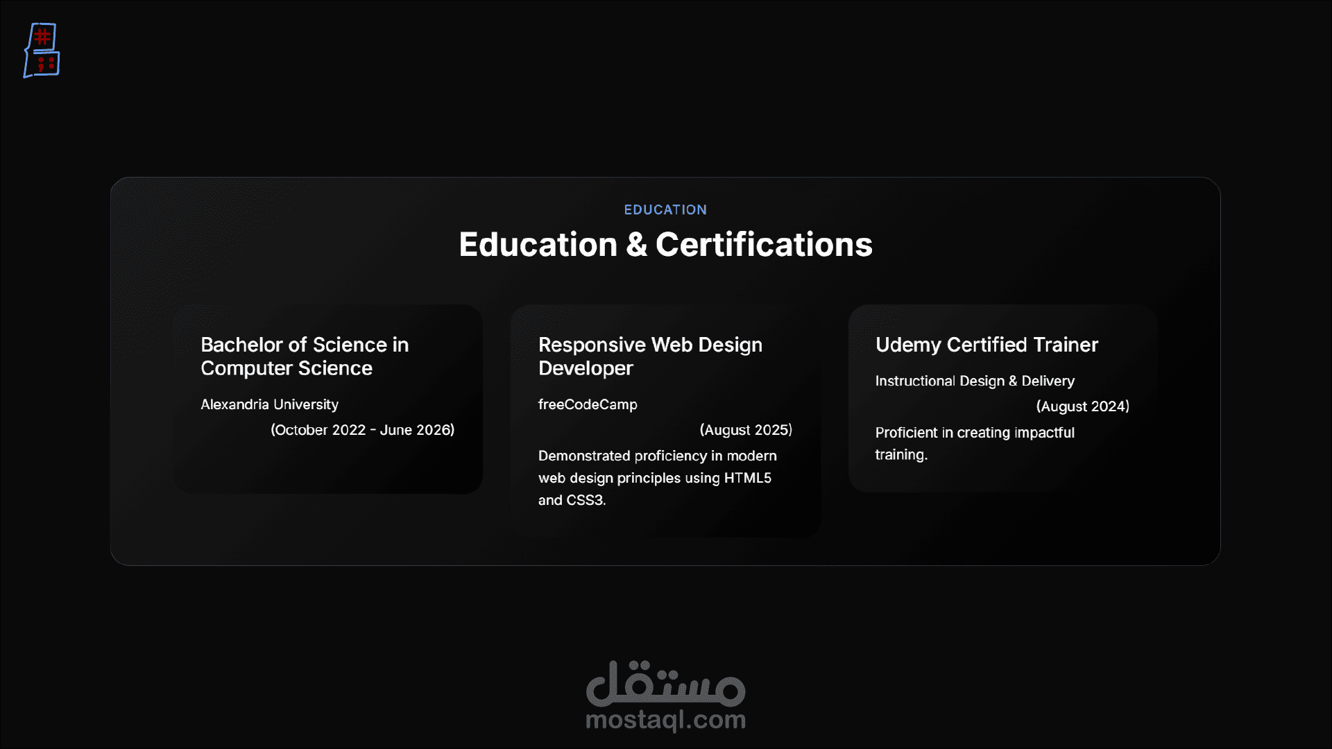 هيكلية محتوى شاملة: ينقسم الموقع إلى أقسام منظمة بعناية لعرض المسيرة المهنية بشكل كامل، وتشمل: نبذة عني، التعليم، المهارات، الخبرات، الخدمات، المشاريع، الإنجازات، آراء العملاء.