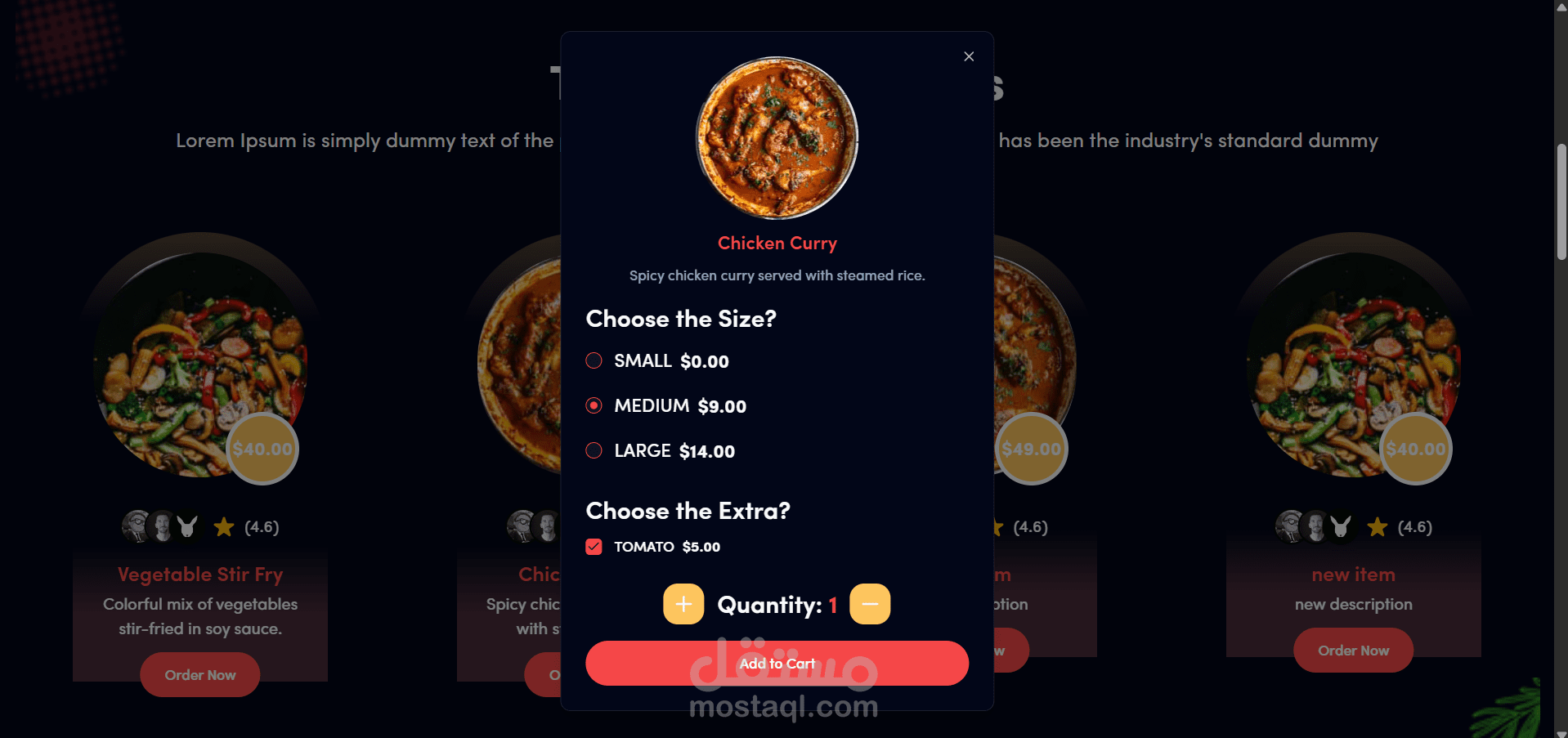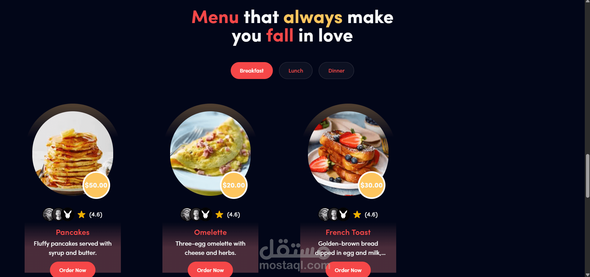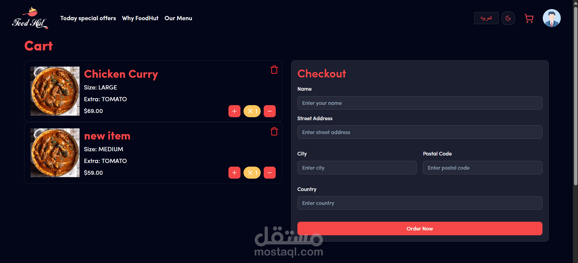 موقع للعملاء: استعراض الأطعمة، إضافة للسلة، وطلب بسهولة.