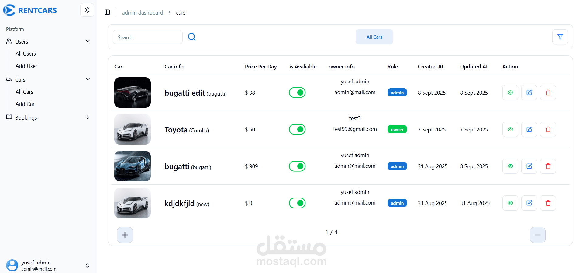 المالك: إدارة سياراته (إضافة – تعديل – حذف)، متابعة الحجوزات، وعرض تاريخ التأجير.