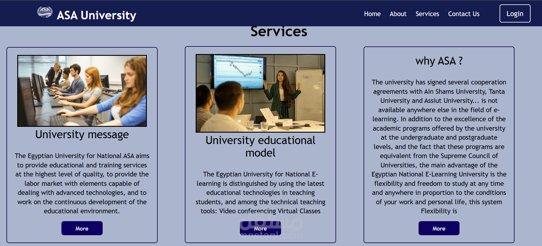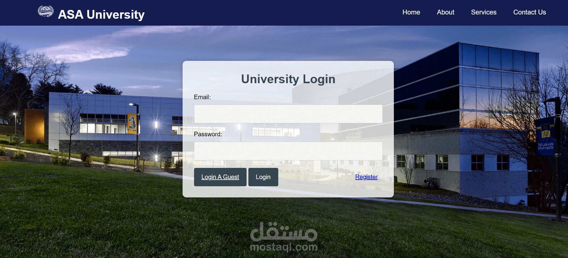 I designed and developed a responsive and modern website for ASA University. The website features a clean landing page with a professional layout, clear navigation menu (Home, About, Services, Contact Us), and a user-friendly login system. It is built with HTML, CSS, and JavaScript (or your actual stack) to ensure a smooth user experience across all devices. This project demonstrates my skills in front-end development, responsive design, and creating visually appealing interfaces for educational institutions.