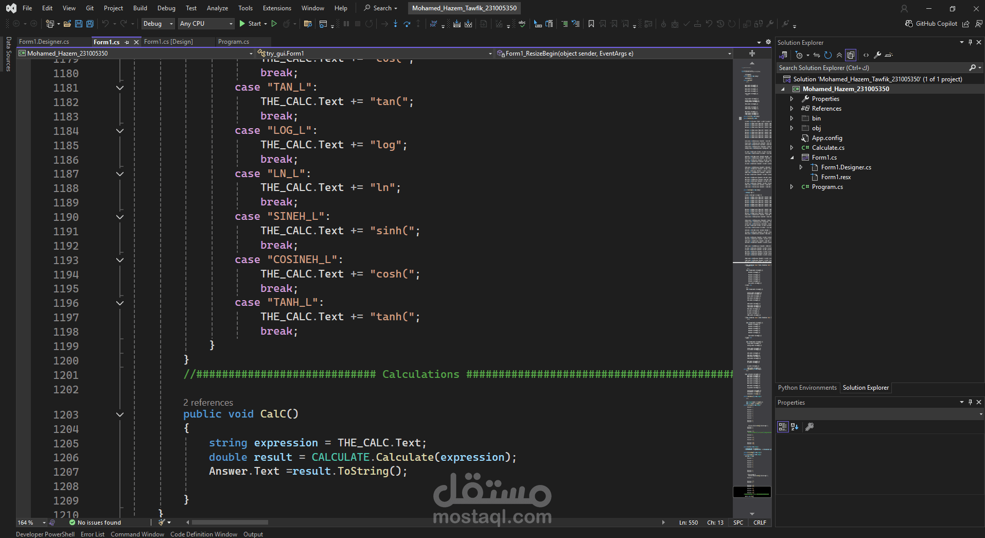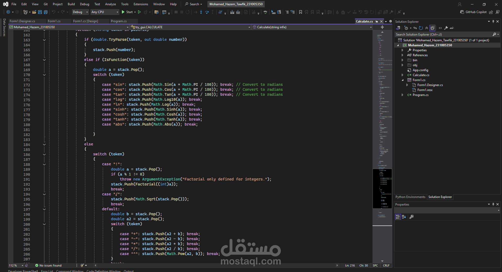 قمت بتطوير تطبيق آلة حاسبة متقدمة باستخدام C# وبيئة Windows Forms، مع الاعتماد على مفاهيم البرمجة الكائنية (OOP) ومهارات هياكل البيانات (Data Structures) في تصميم وتنفيذ الخوارزميات.