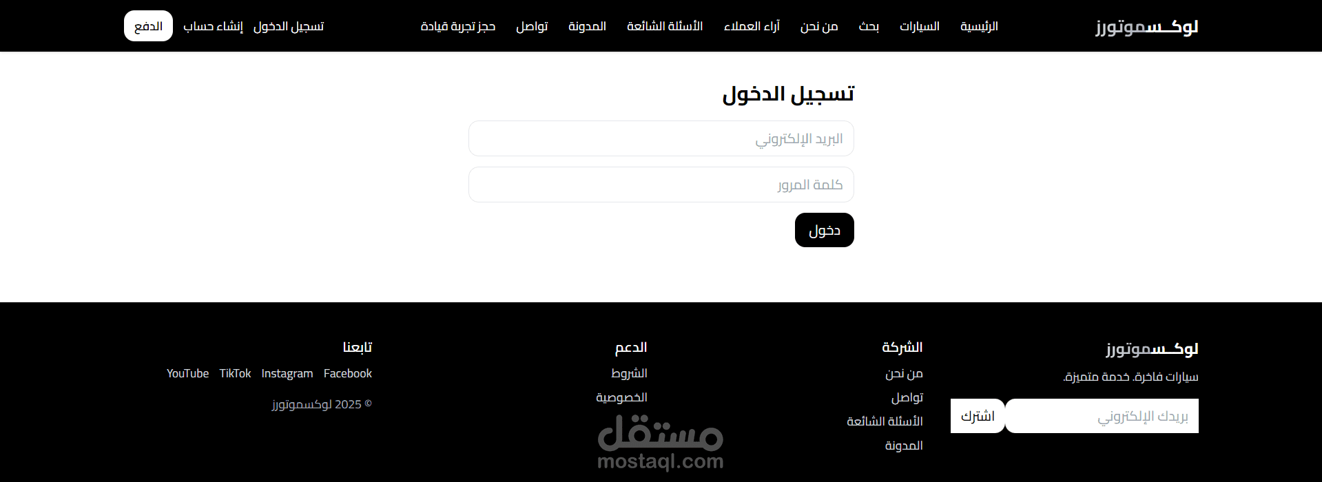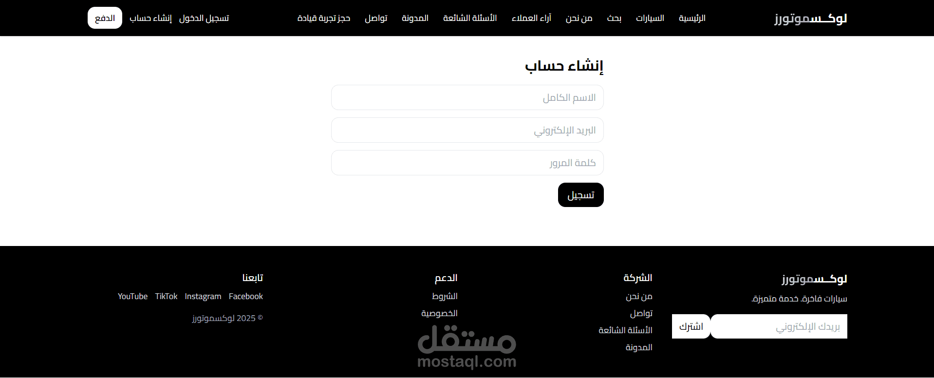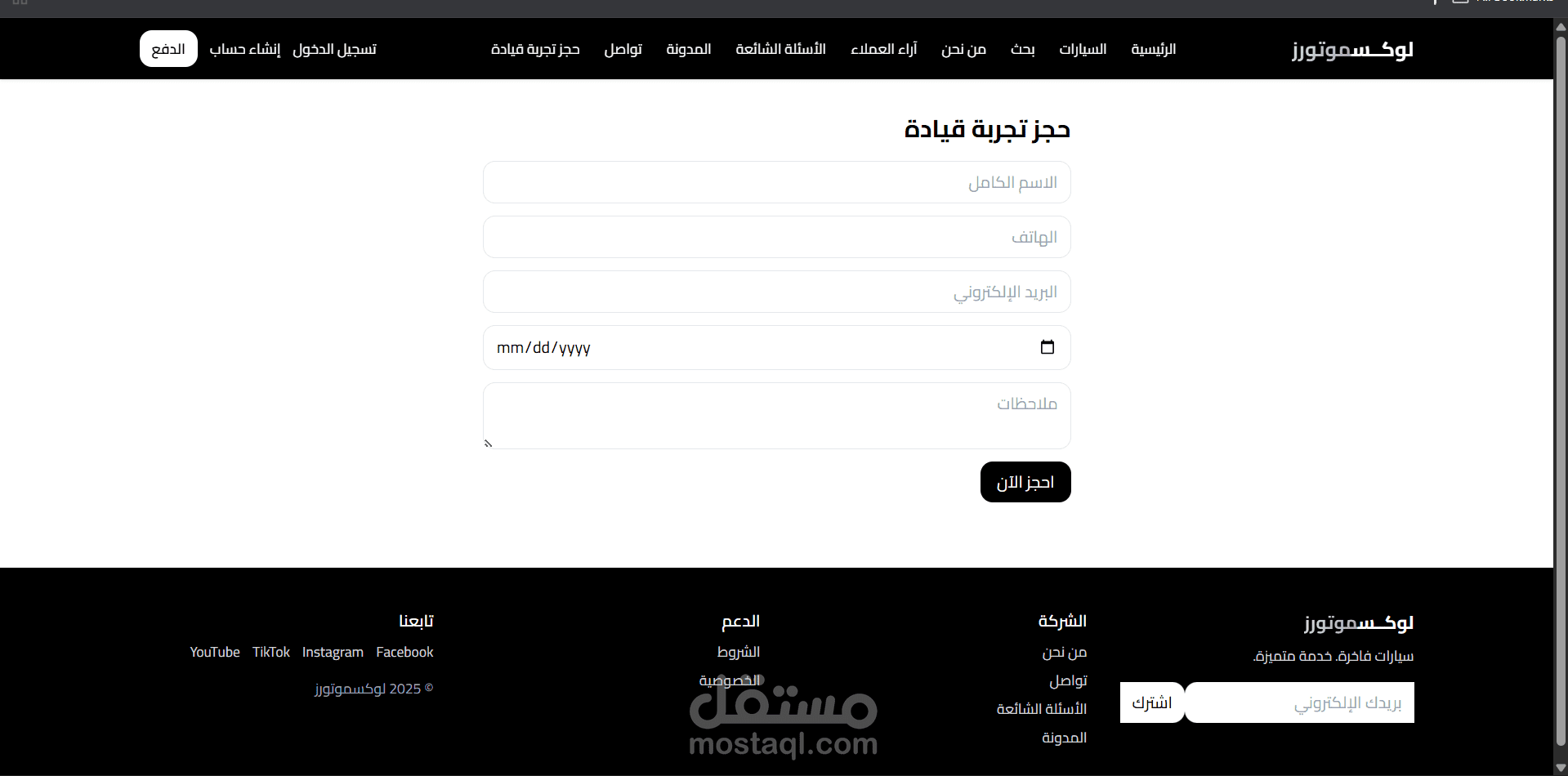 موقع متكامل لبيع وتأجير السيارات يتيح للمستخدمين استعراض السيارات المتاحة مع التفاصيل والصور والأسعار، مع إمكانية البحث والتصفية حسب النوع أو السعر أو الموديل. يحتوي الموقع على نظام عضويات لتسجيل العملاء وإدارة حساباتهم، ولوحة تحكم لإدارة الإعلانات والحجوزات، مما يوفر تجربة سهلة واحترافية لكل من البائعين والمستأجرين.