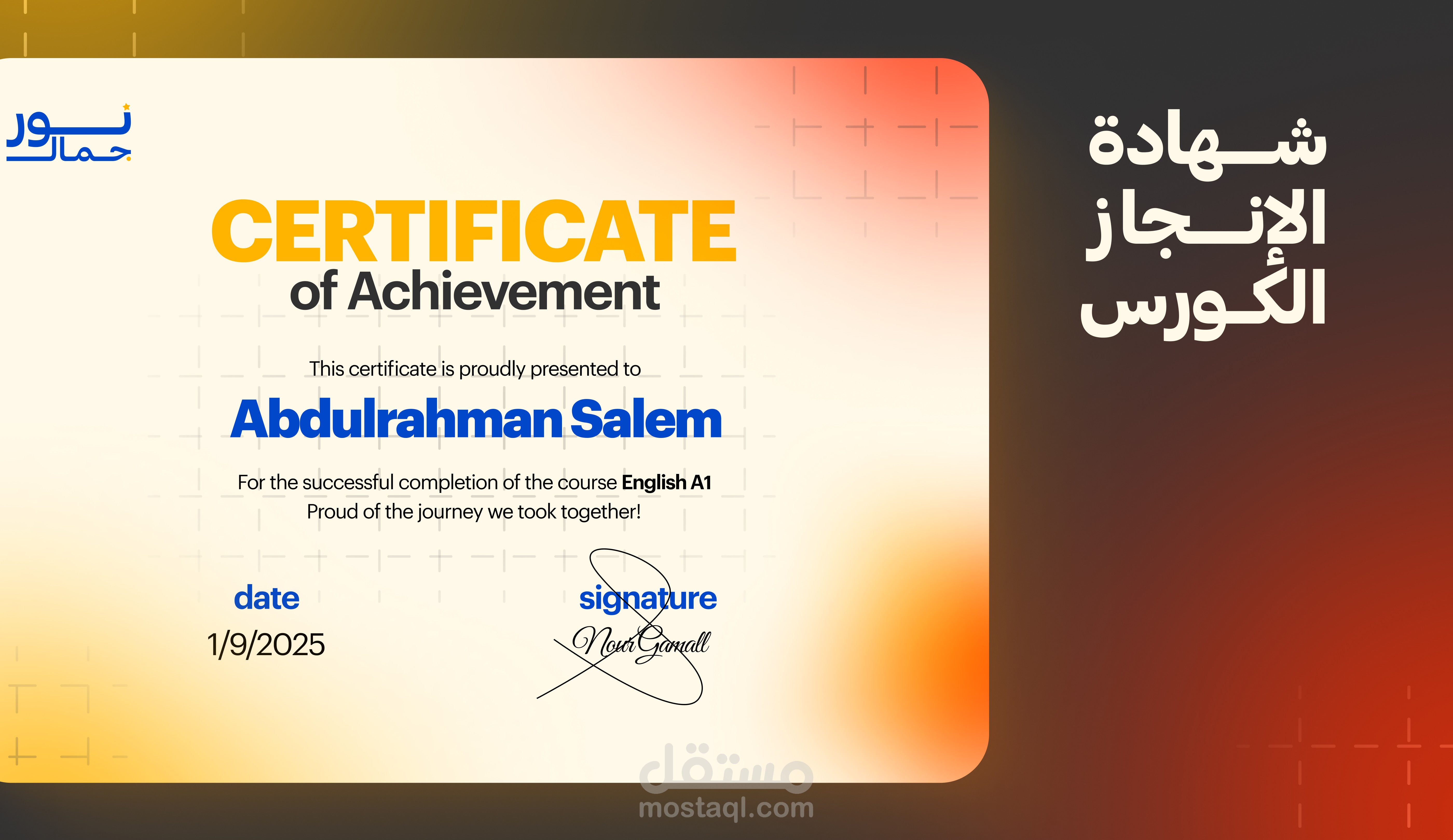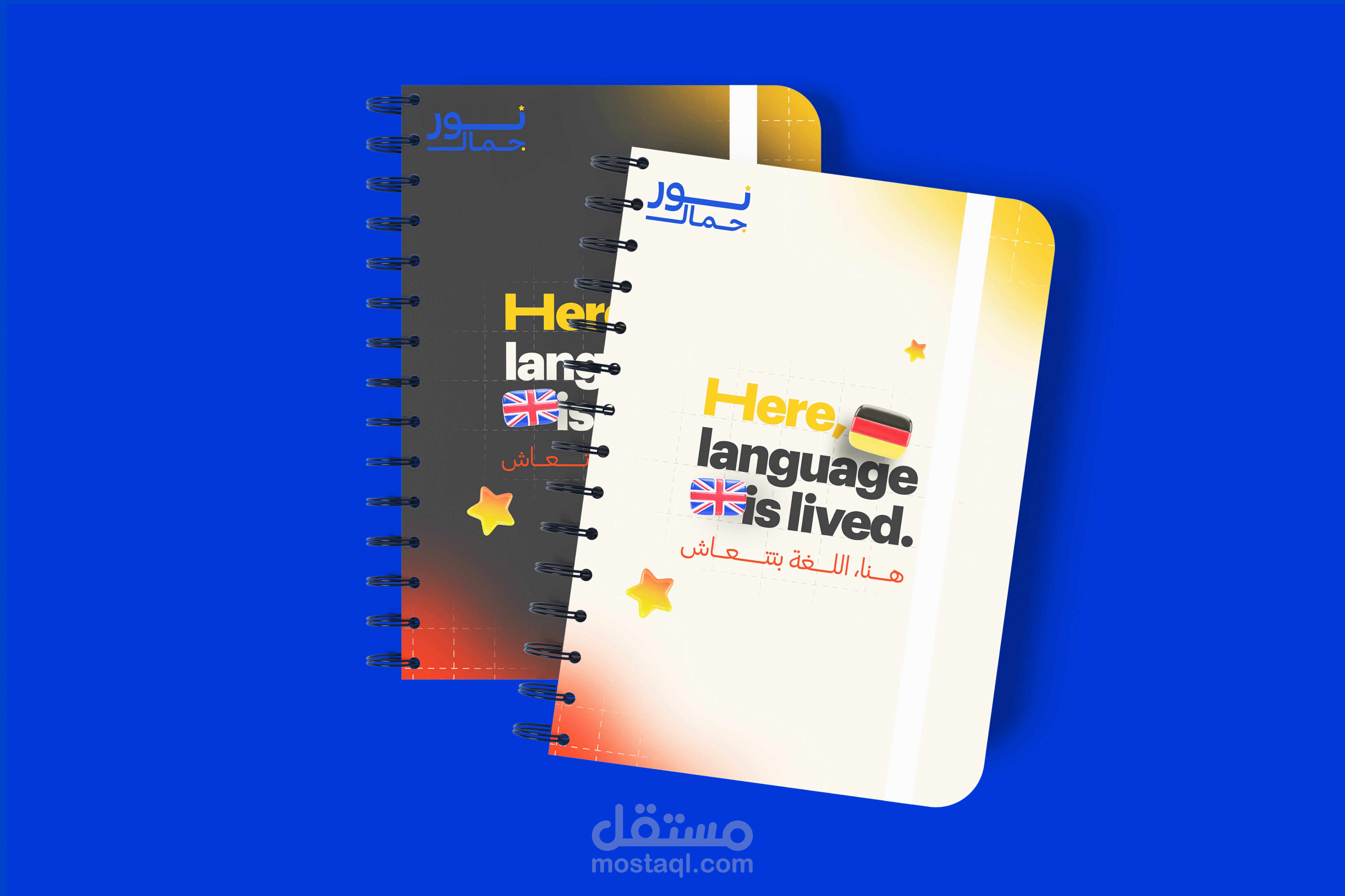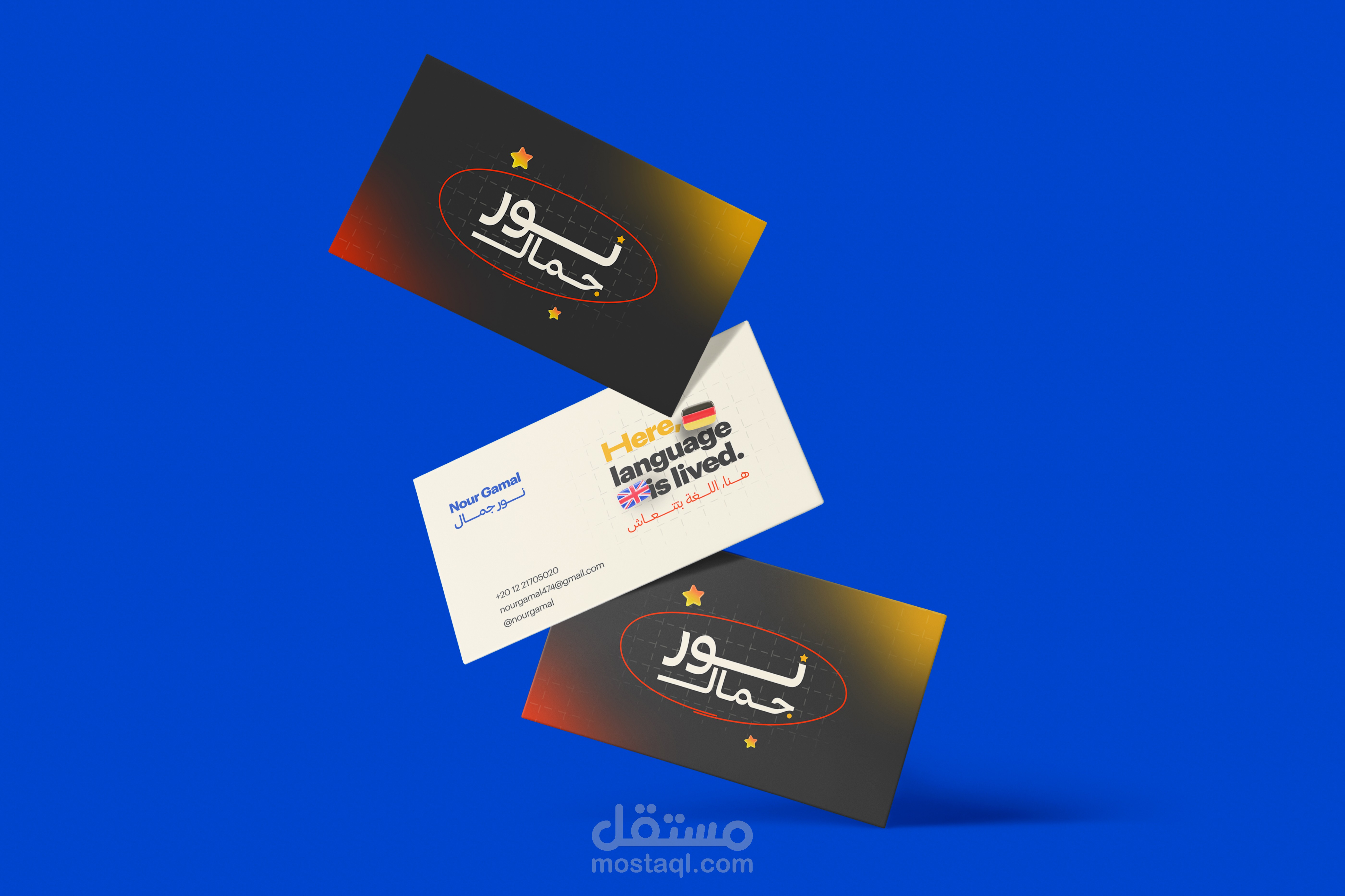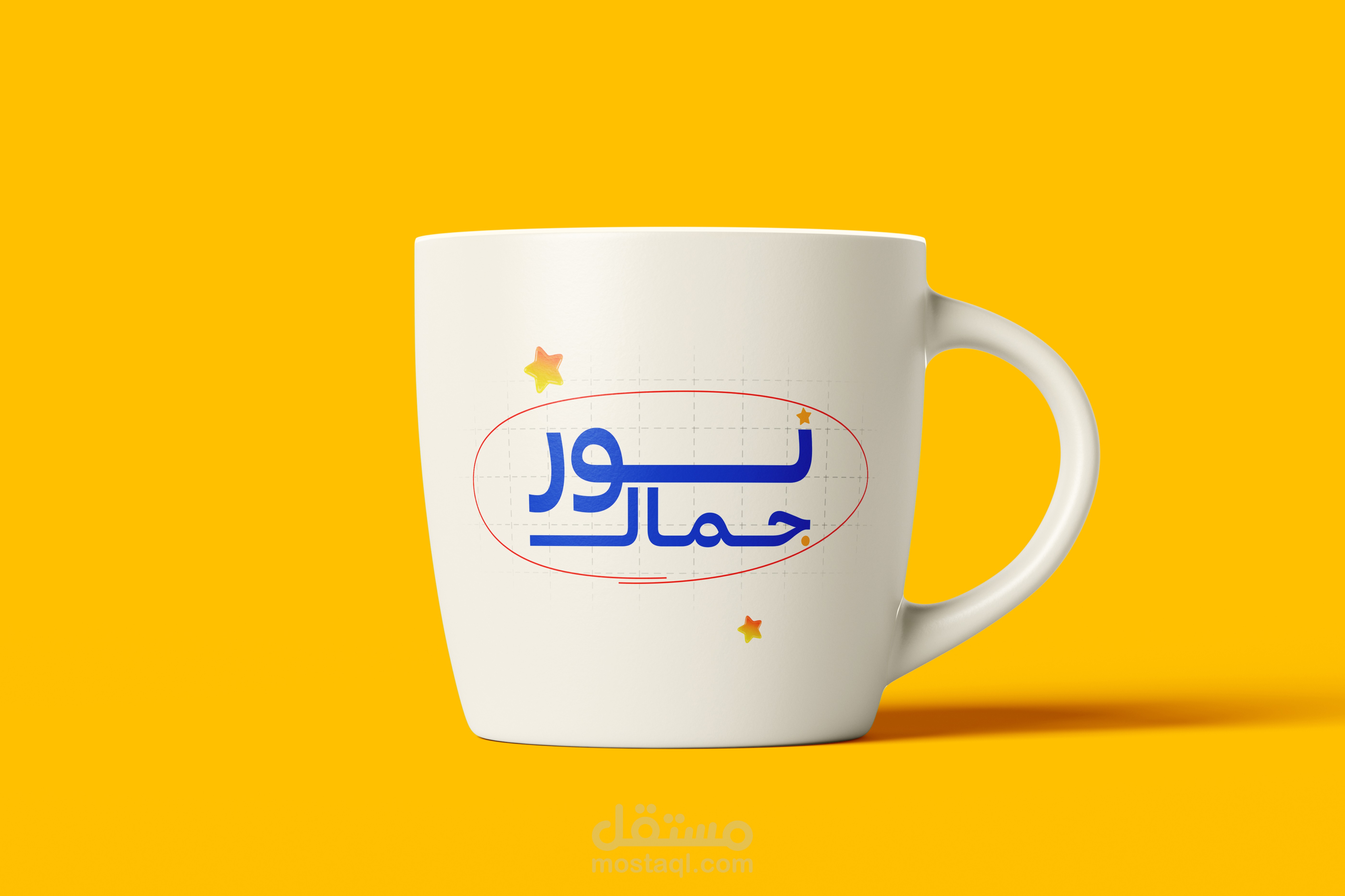 اللوجو: صممنا لوجو عربي فريد بيحكي قصة. الفكرة العبقرية كانت في استبدال نقطة حرف "النون" بـ نجمة ()، عشان نربط اسم "نور" بمعنى الضوء والإلهام.