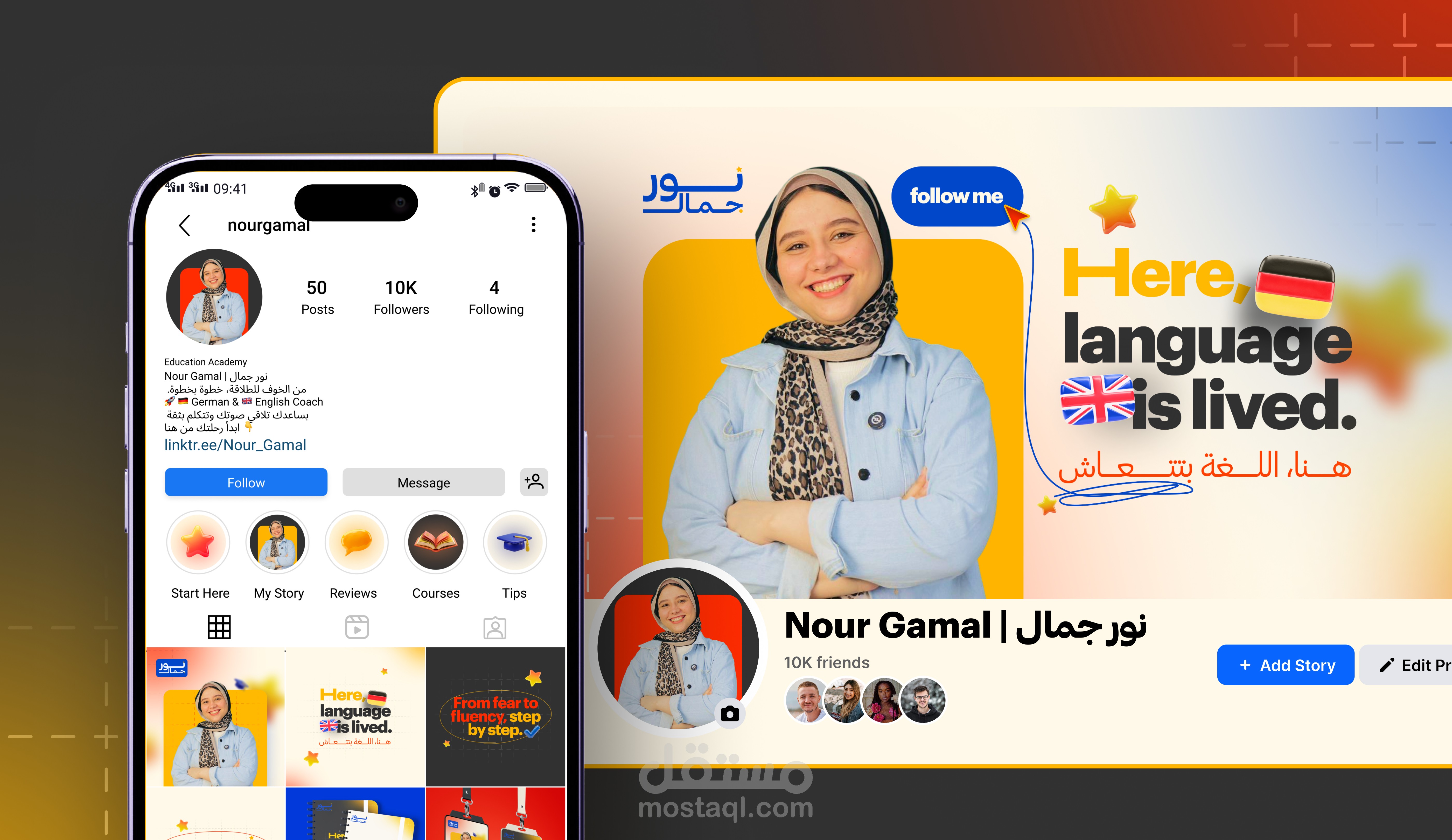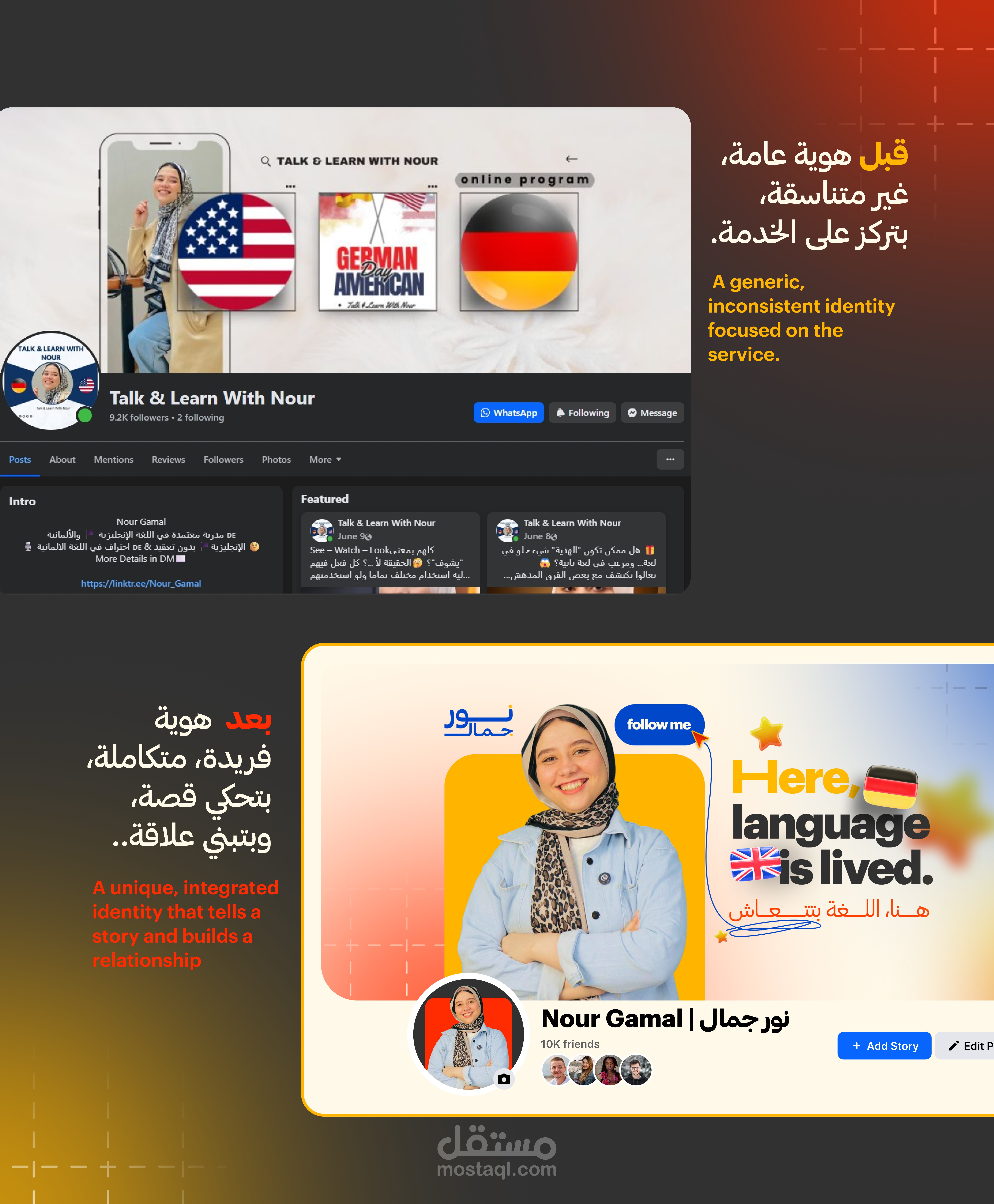 دراسة حالة كاملة لمشروع إعادة بناء هوية بصرية واستراتيجية للمدربة "نور جمال"، المتخصصة في اللغتين الإنجليزية والألمانية. الهدف كان تحويلها من مجرد مقدم خدمة إلى علامة تجارية شخصية (Personal Brand) ليها روح، صوت، وشكل مميز يلهم جمهورها ويبني الثقة.