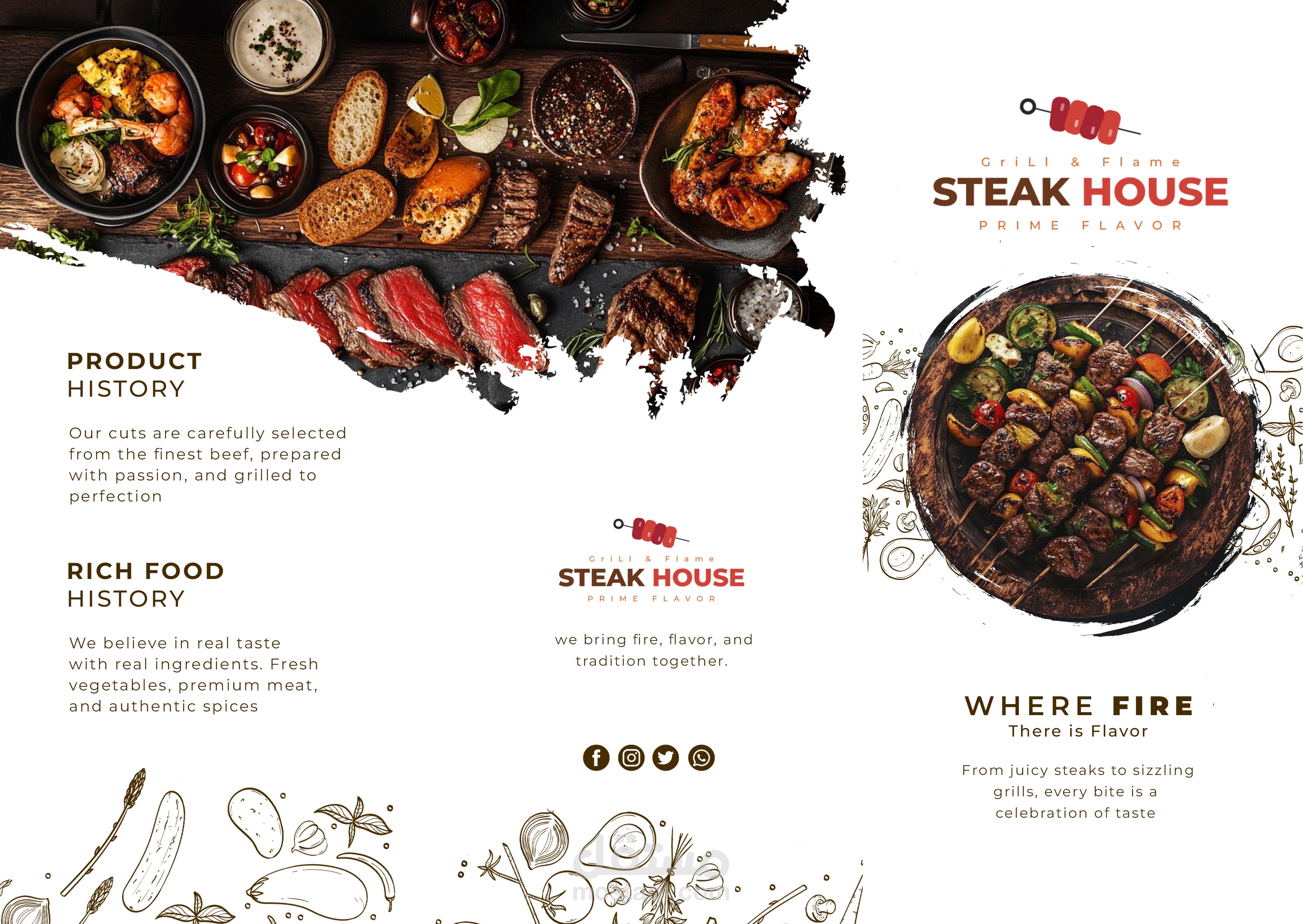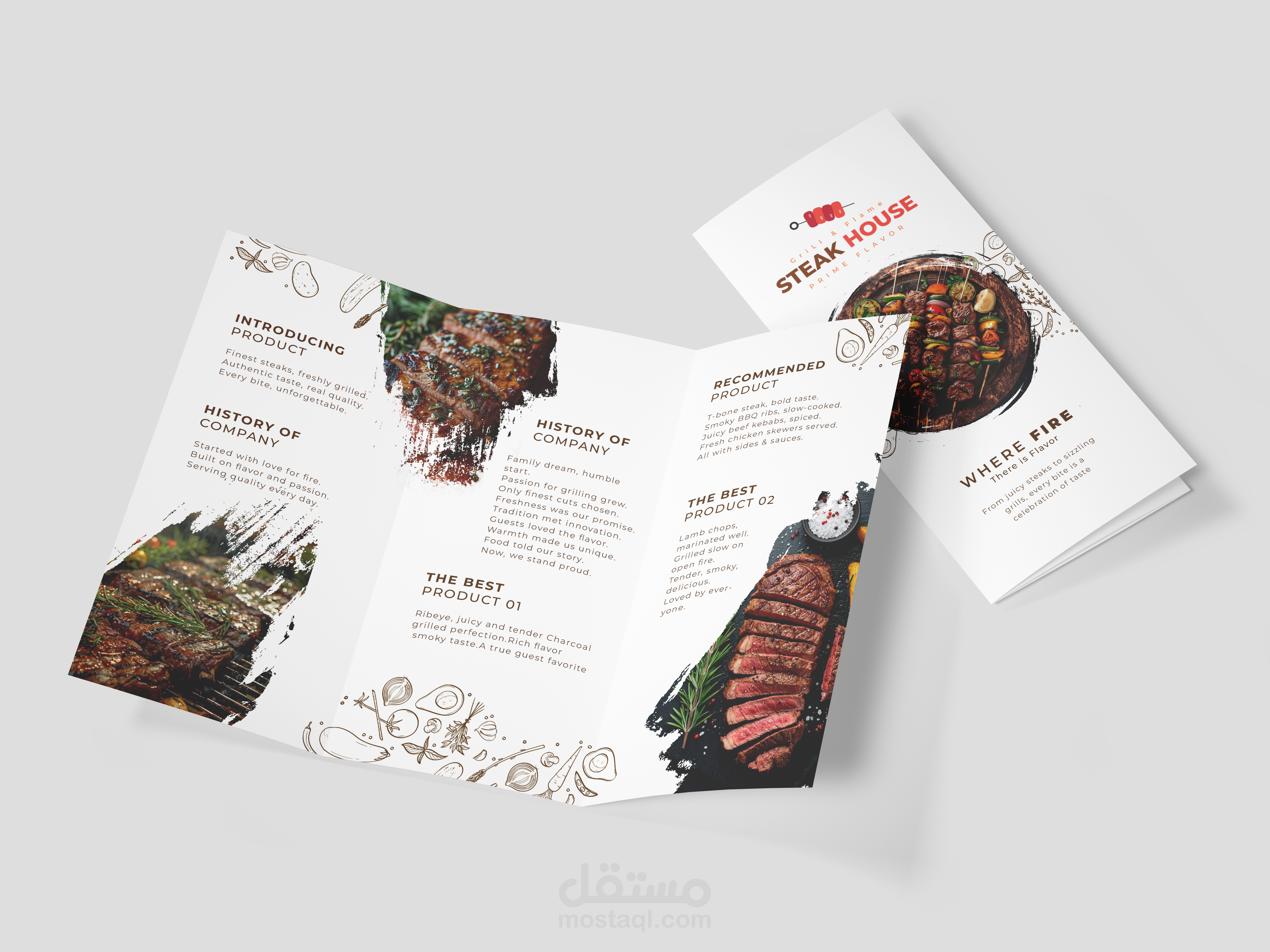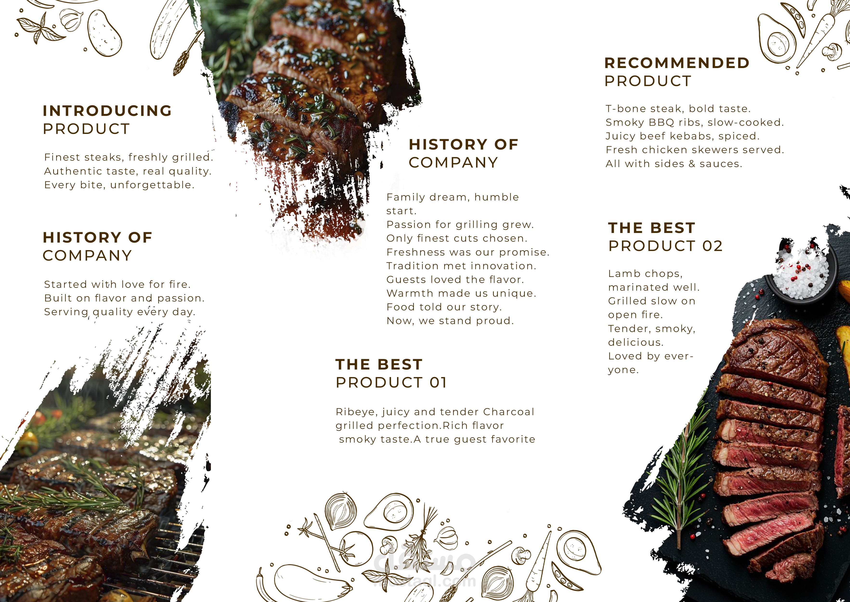 This brochure design was created for a steakhouse brand, blending modern elegance with rich, mouth-watering visuals. The layout highlights the premium quality of the food through bold photography, warm colors, and clean typography. The goal was to communicate tradition, flavor, and authenticity while keeping a sleek and professional style.