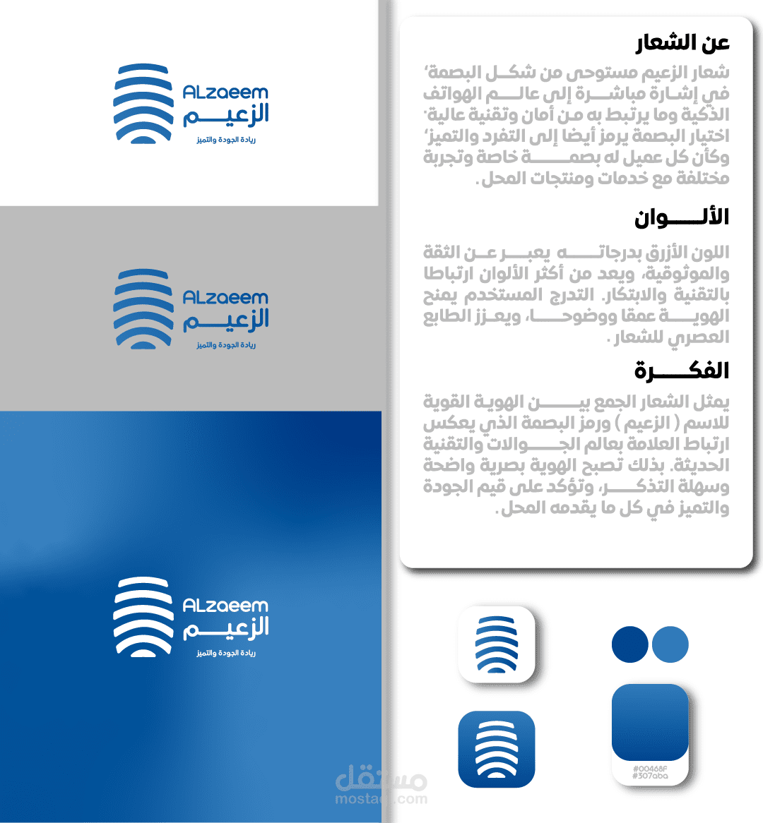 ا لفكرة بشكل عام تمثل قوة الاسم الزعيم مع رمز البصمة اللي يربطنا بمجال الجوالات. النتيجة شعار بسيط، مميز، وسهل يعلق في بال أي شخص يشوفه.
