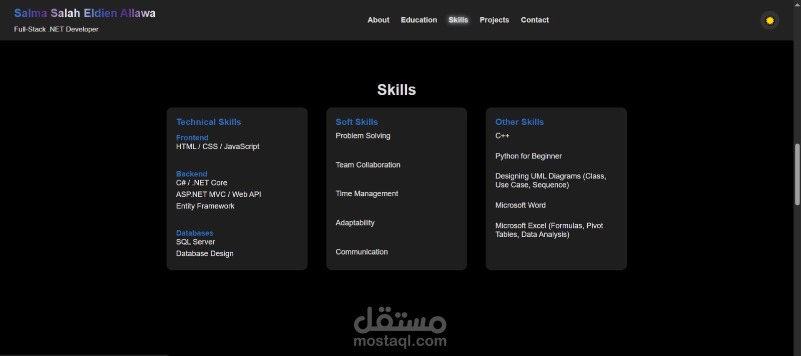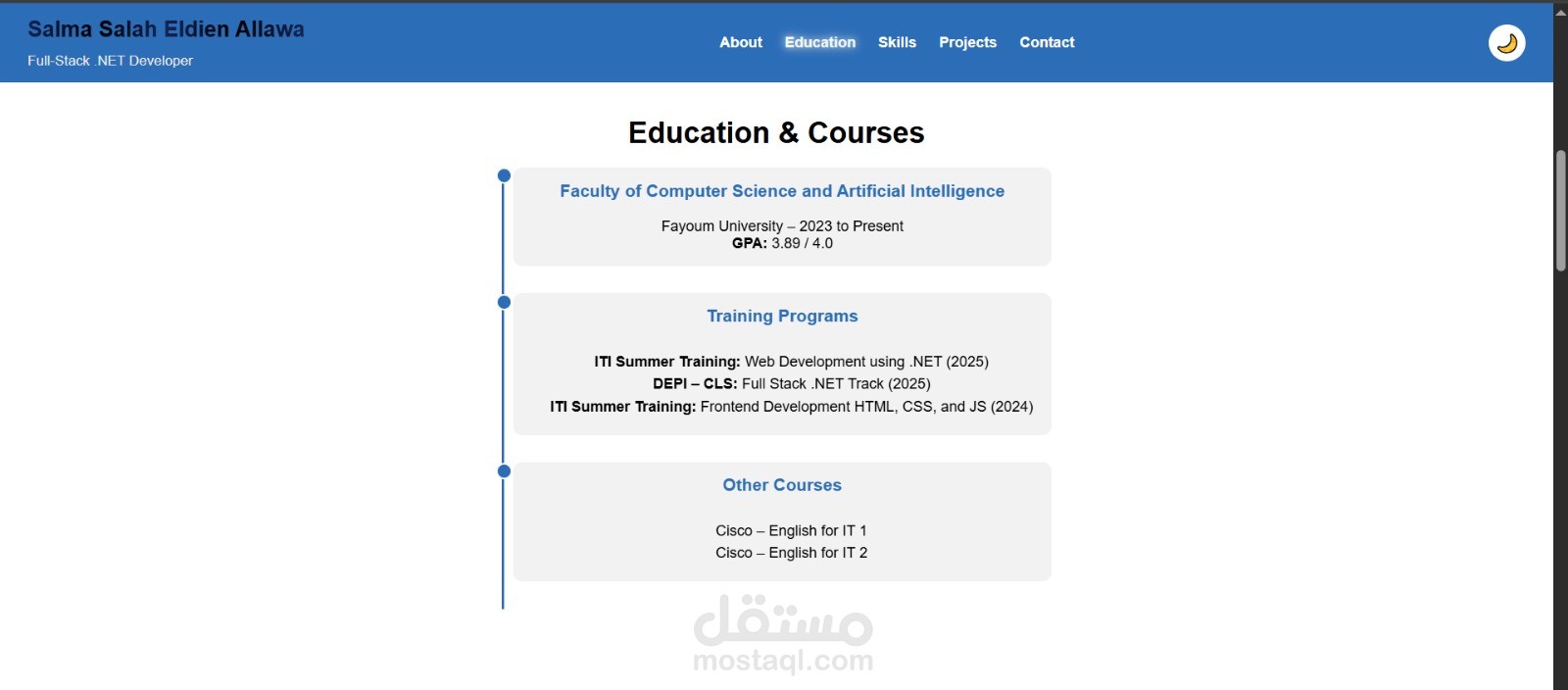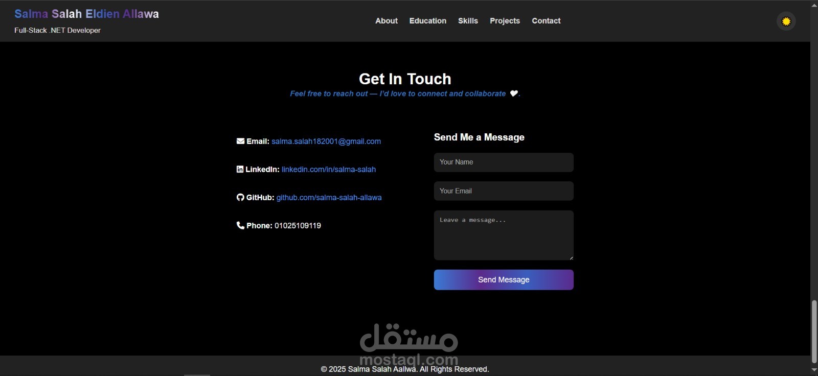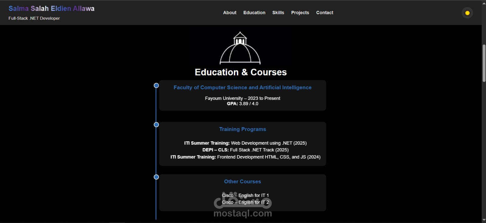 قمت بتصميم وتطوير موقع شخصي (Portfolio Website) باستخدام تقنيات حديثة لعرض الخبرات والمهارات والمشاريع بشكل احترافي.