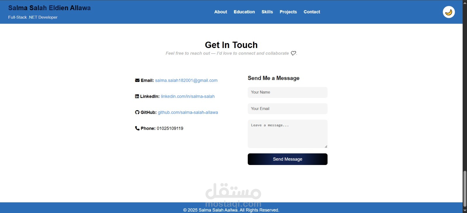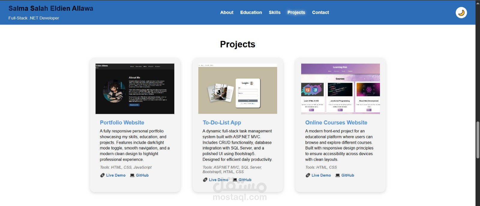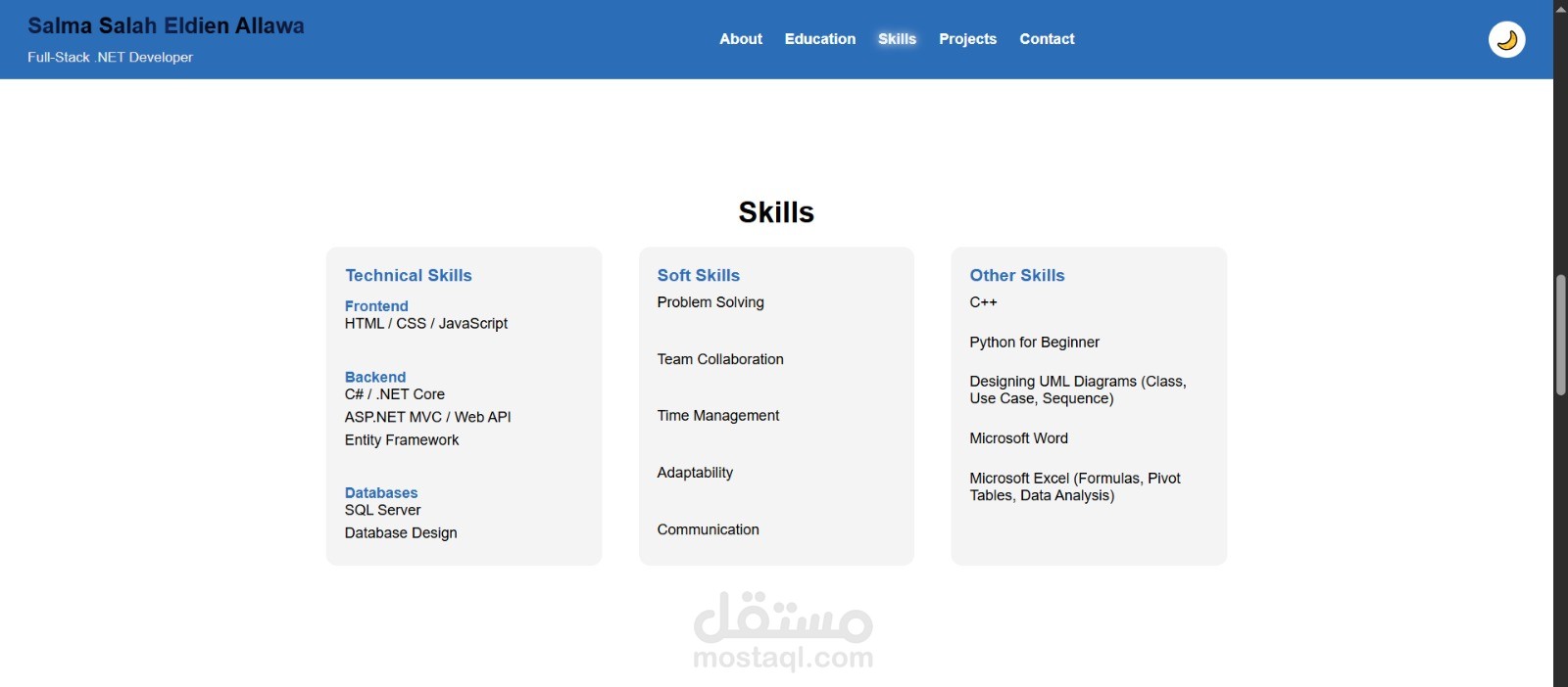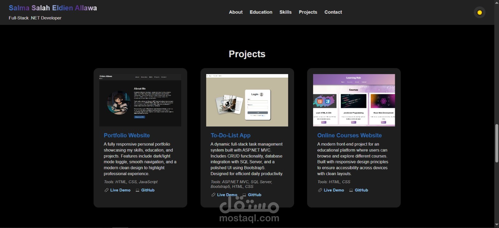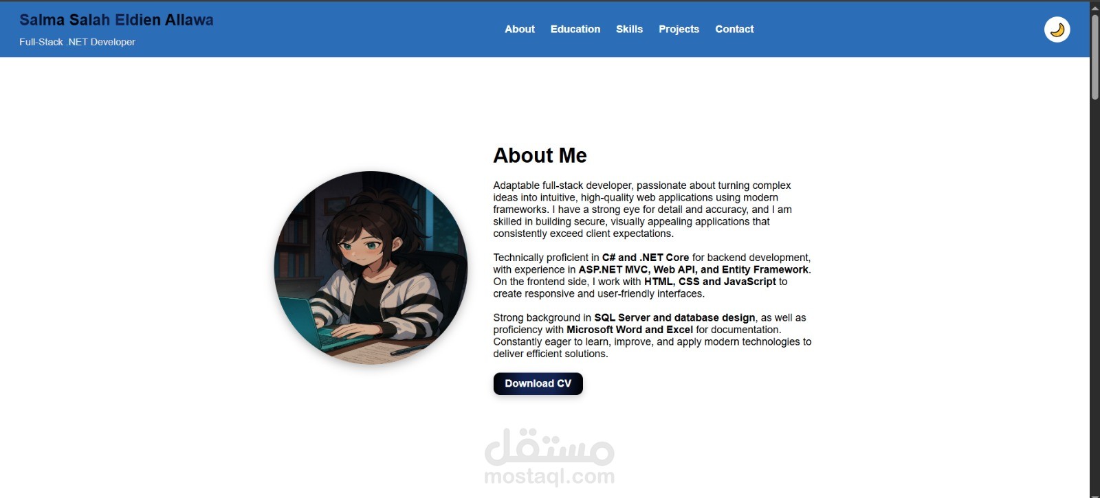 قمت بتصميم وتطوير موقع شخصي (Portfolio Website) باستخدام تقنيات حديثة لعرض الخبرات والمهارات والمشاريع بشكل احترافي.