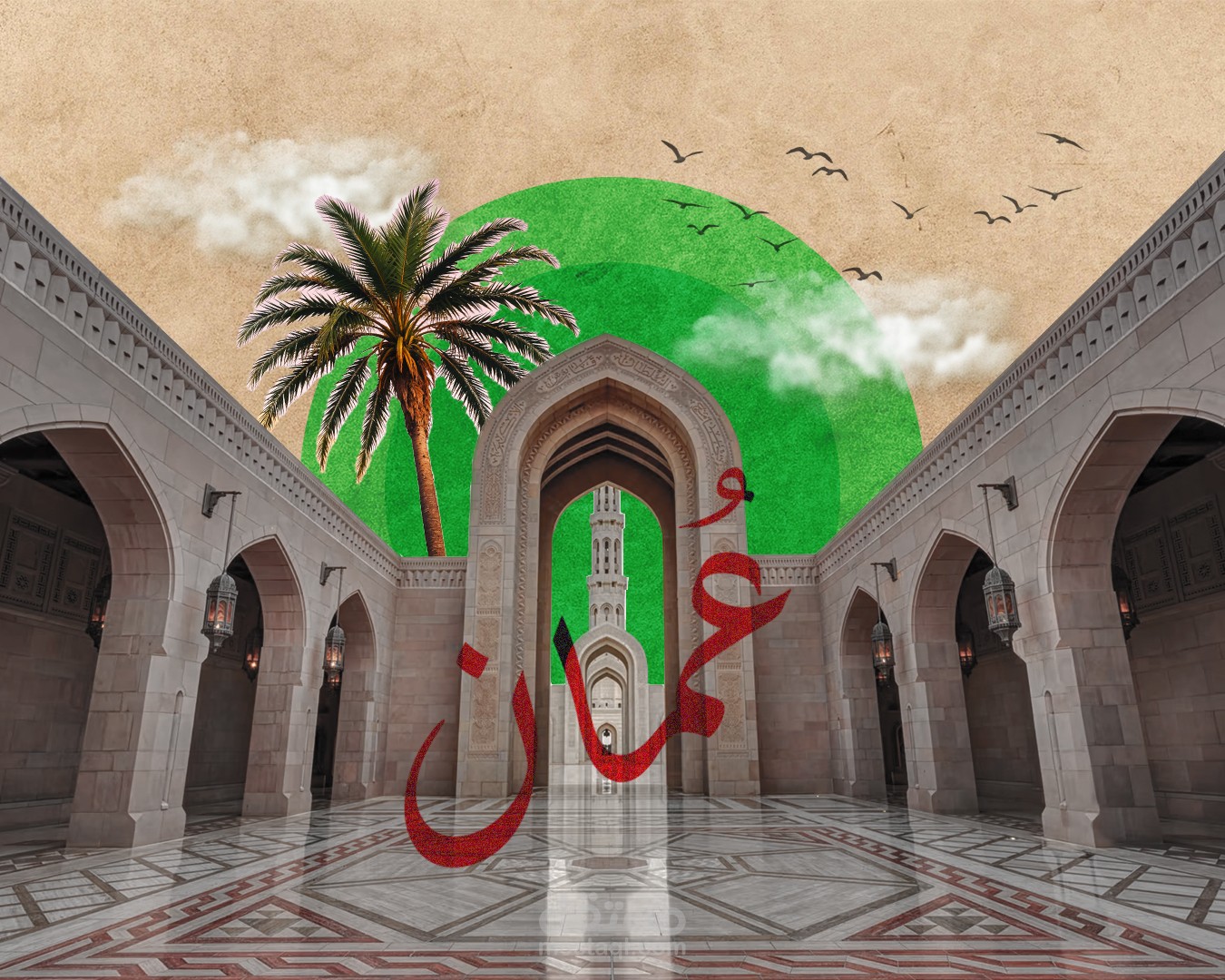 تصميم بوستر كولاج لسلطنة عمان يبرز الهوية الثقافية والطبيعة العُمانية عن طريق دمج الصور باستخدام ادوبي فوتوشوب مع الاهتمام بتوزيع العناصر بشكل متوازن وتناسق الالوان.