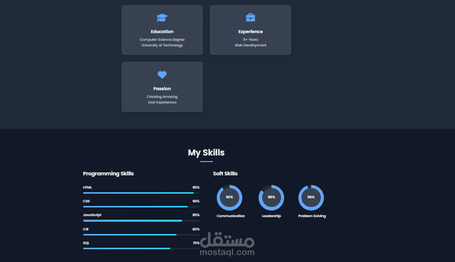 -قسم المهارات يحتوي على Progress Bars أو Charts متحركة. -Dark / Light Mode toggle للتحكم في الألوان.