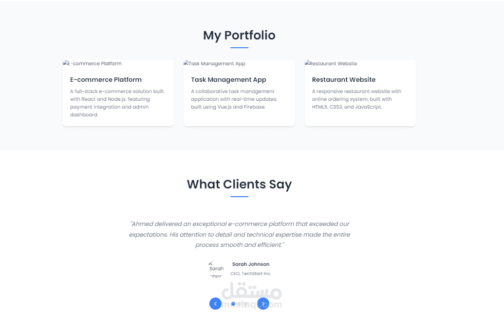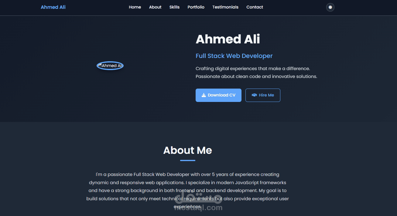 - أقسام متنوعة: مقدمة (Hero)، نبذة عنك، المهارات، الأعمال / المشاريع، شهادات العملاء، تواصل، وتذييل الصفحة.