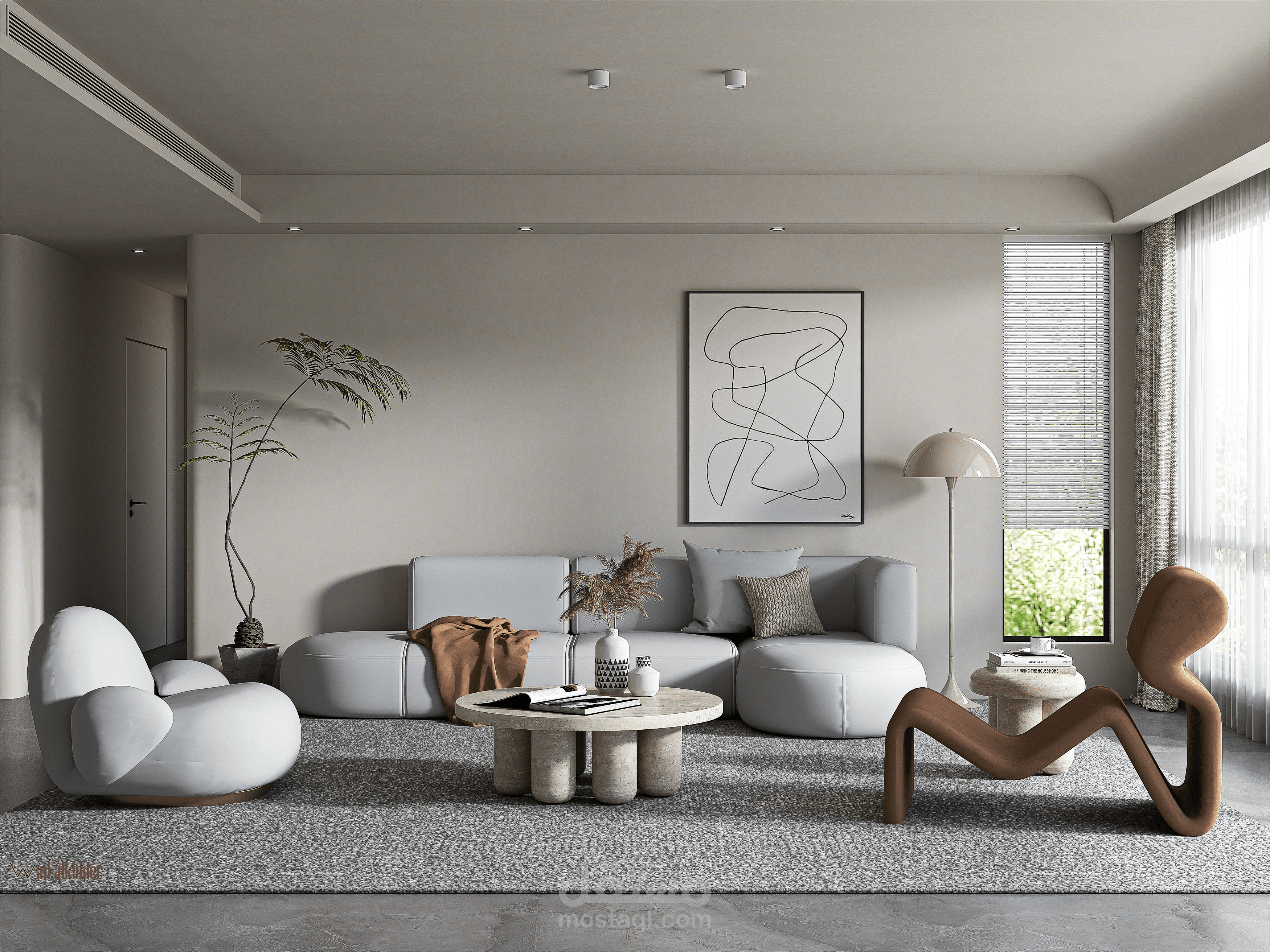 • أثاث بتصميم عضوي ومعاصر: كنبة منحنية، كرسي بارز بتصميم نحتّي، وطاولة قهوة دائرية بسطح مميز