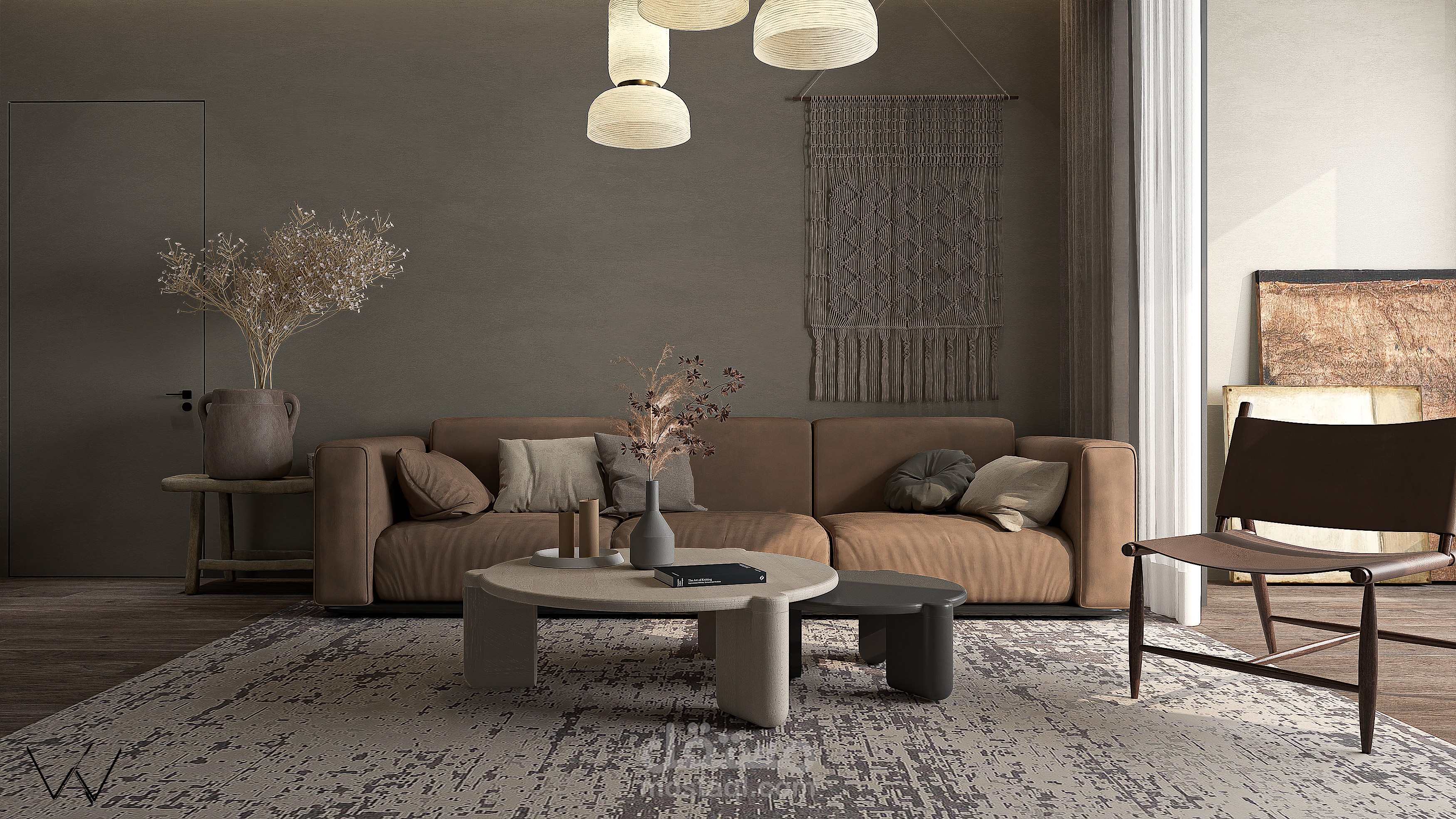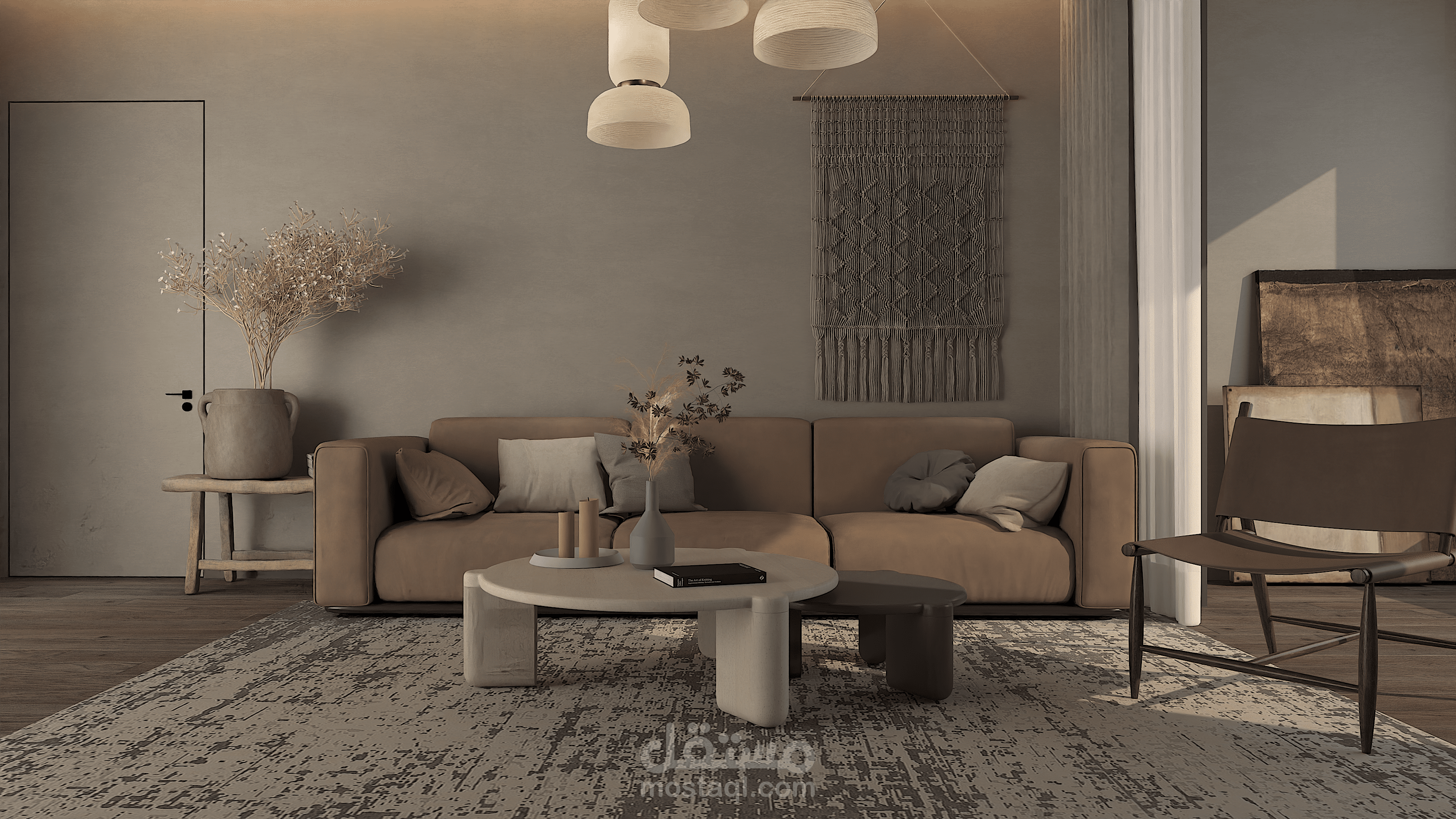 في هذا المشروع، ركّزت على خلق بيئة مريحة وأنيقة باستخدام خامات طبيعية وتدرجات ترابية: