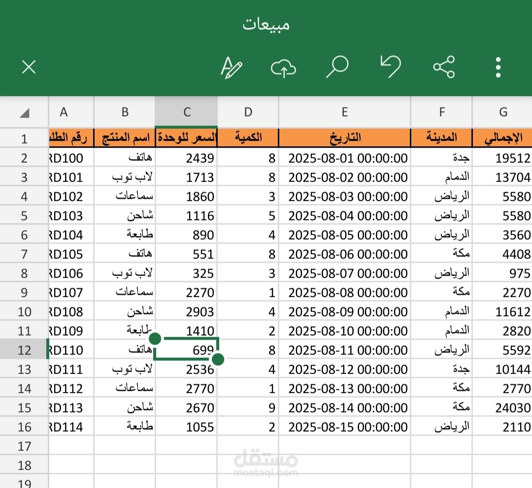 عملت ملف Excel يحتوي على بيانات طلبات بيع (اسم المنتج – السعر – الكمية – المدينة – التاريخ) مع حساب تلقائي لقيمة الإجمالي.